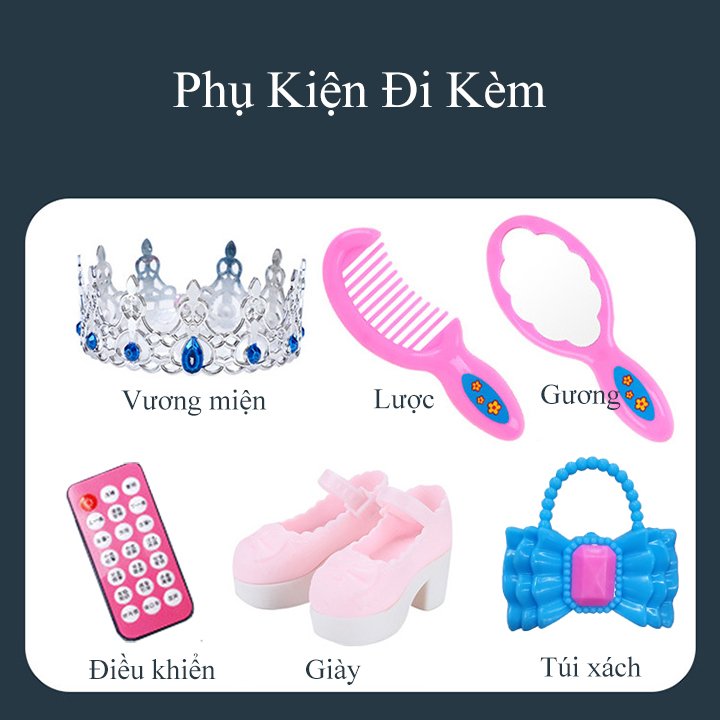 - Phụ kiện: Gồm 1 Điều Khiển + 1 Gương + 1 Lược + 1 Vương Miện + 1 Túi Xách + 1 Đôi Giày (Được làm bằng nhựa ABS).