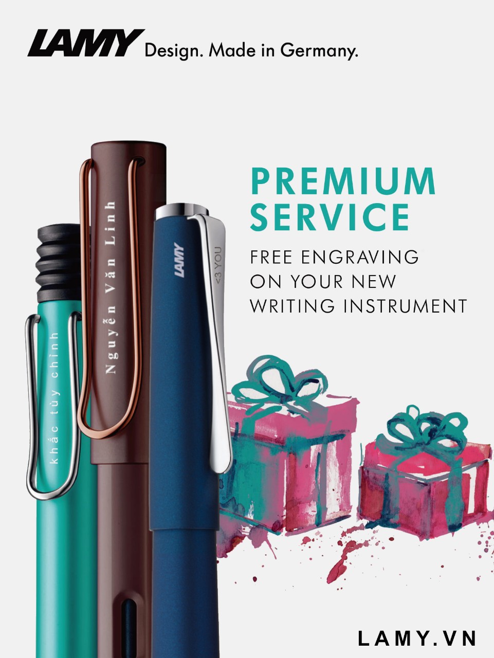 - Lamy chỉ nhận khắc lên bút có thân kim loại, việc khắc lên thân nhựa sẽ không có tính thẩm mỹ và dễ gây hỏng sản phẩm.