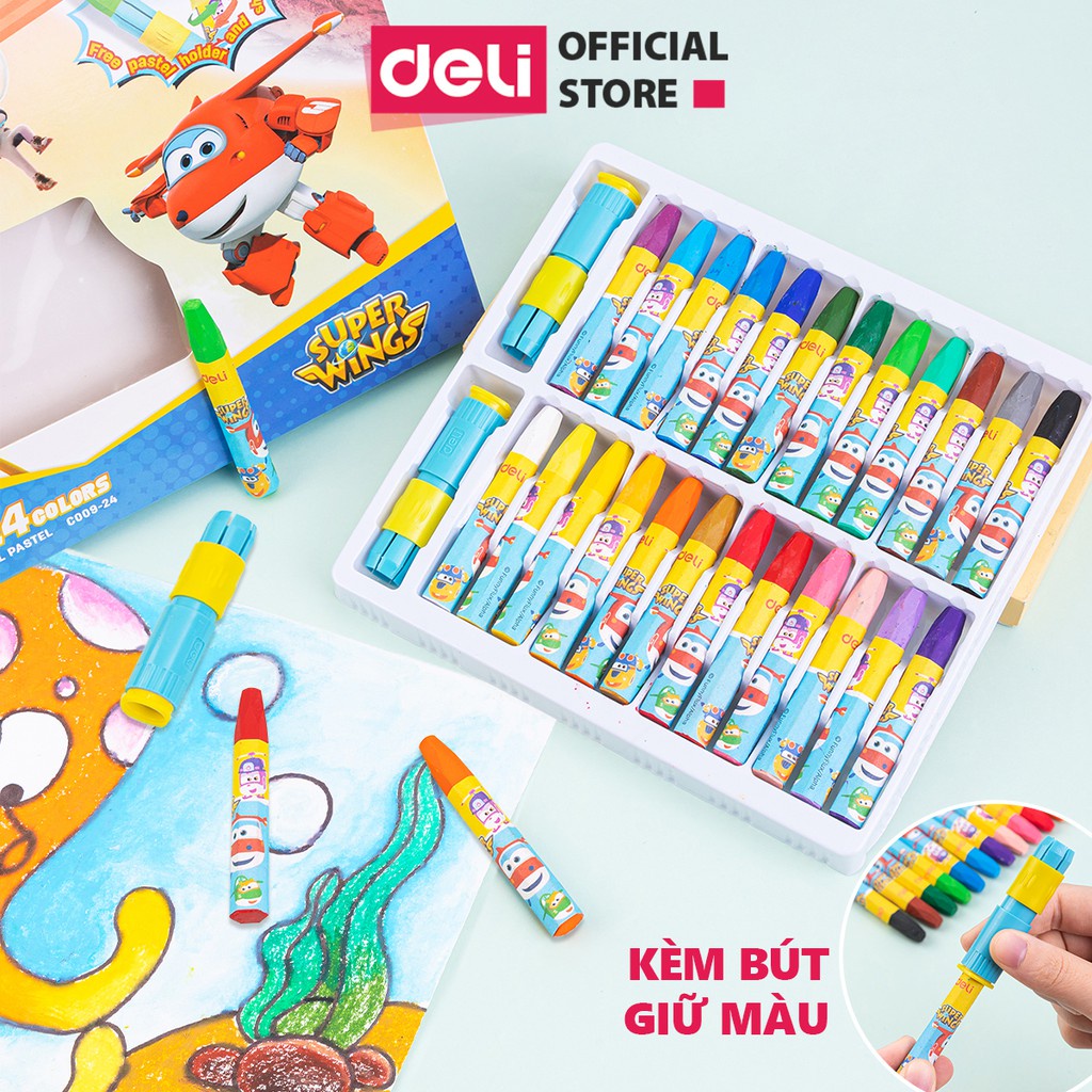 Giới thiệu Bút sáp dầu Deli x SuperWings Đội Bay Siêu Đẳng 24 màu tươi sáng, tô mịn - an toàn cho bé - tặng kẹp chống bẩn - EC009