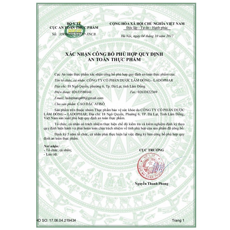 - Tên hàng hóa: Cao đặc Atiso - 500g - Tên và địa chỉ của tổ chức/cá nhân chịu trách nhiệm về sản phẩm: + CÔNG TY CỔ PHẦN DƯỢC LÂM ĐỒNG - LADOPHAR + Địa chỉ: 18 Ngô Quyền, P.6, Tp.Đà Lạt, Lâm Đồng - Xuất xứ của sản phẩm: Việt Nam