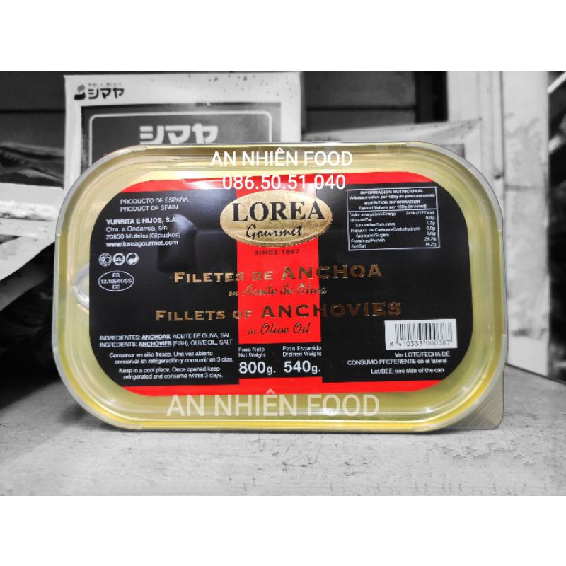 Cá Anchovy ngâm dầu Cá cơm biển phi lê sốt dầu oliu Xuất xứ : Tây Ban Nha Nhãn hiệu : Lorea Quy cách : Hộp 800 Gram Bảo quản : Nơi khô ráo thoáng mát Ngày sản xuất và Hạn sử dụng : In trên sản phẩm.