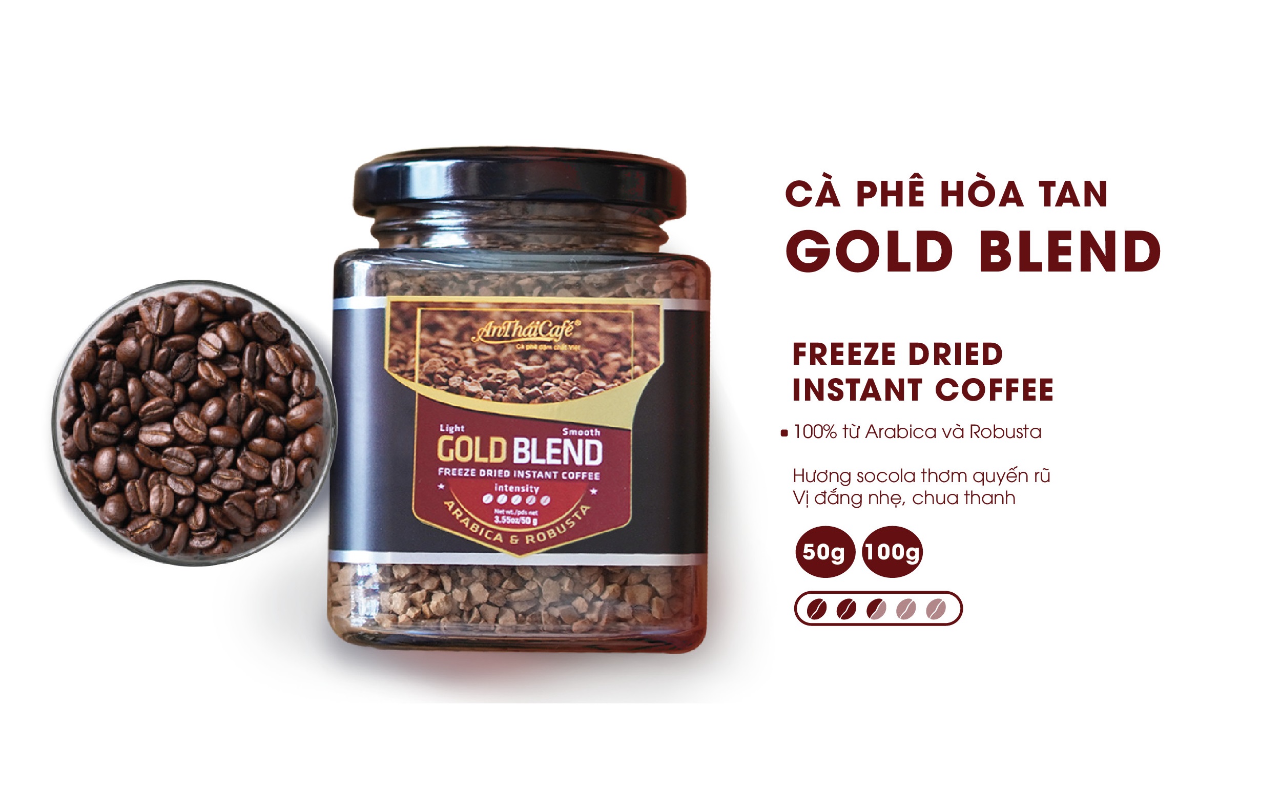 Cà phê hoà tan sấy lạnh Gold Blend là sự kết hợp tinh tuý giữa loại cà phê Arabica và Robusta hảo hạng.