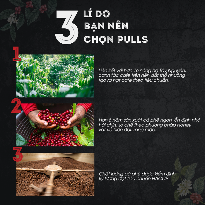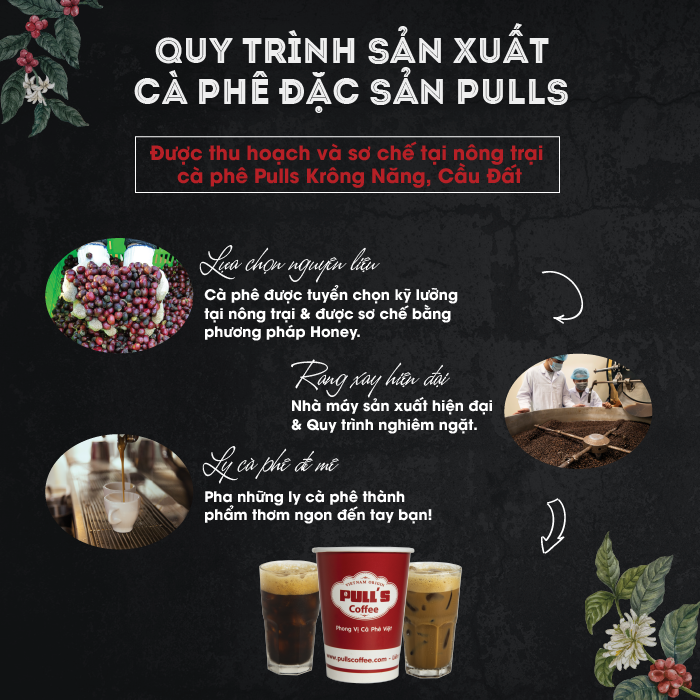 Với kinh nghiệm trên 8 năm thực chiến, máy móc thiết bị hiện đại, quy trình sản xuất chặt chẽ, nhân công lao động lành nghề, Pull’s luôn tự hào là một doanh nghiệp mang lại cho mọi Quý thực khách những ly cà phê đầy đê mê và kinh tế nhất.