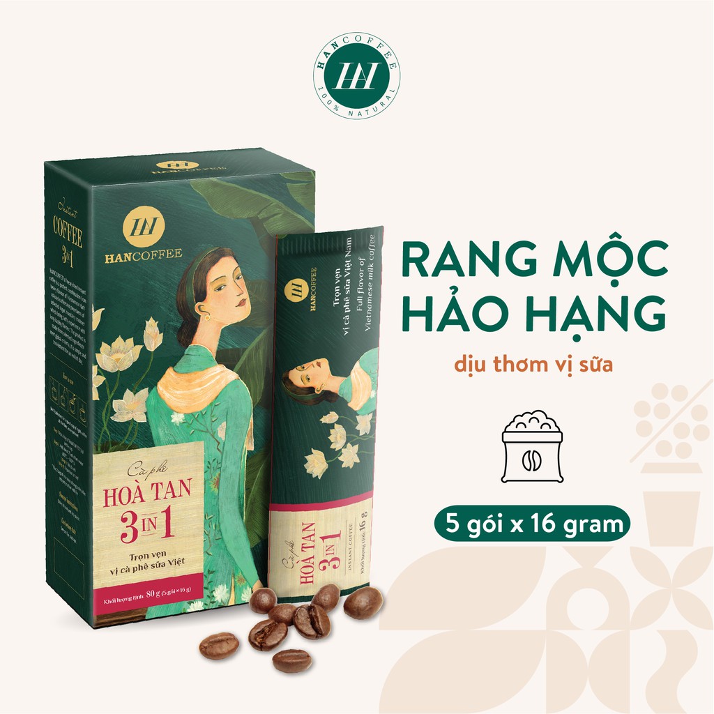 ☕ MÔ TẢ SẢN PHẨM - Cà phê hoà tan 3in1 HANCOFFEE được sản xuất bằng phương pháp sấy lạnh, giúp lưu giữ những hương vị thơm ngon nhất của hạt cà phê hảo hạng. - Cà phê hòa tan HANCOFFEE được làm từ những hạt cà phê Robusta, Arabica trứ danh của cao nguyên Việt, lưu giữ trọn vẹn hương vị của cà phê - Phù hợp với giới văn phòng, người bận rộn thường xuyên di chuyển - Hạt cà phê được thu hoạch từ vùng Yasao - Chư Pảh - Gia Lai & Đắk Glei - Kon Tum - Mô tả hương vị + Màu sắc: Nâu sữa nhạt + Hương vị: Ngọt nhẹ, đắng dịu, êm. Đậm đà hương cà phê, thơm nhẹ mùi sữa. Nổi trội hương vị của ngũ cốc, đậu nành. + Hậu vị: Dài, êm - Kết quả của hành trình cà phê FARM TO CUP đầy tự hào: + Cà phê bản địa được hái chín thủ công. + Lên men bằng kỹ thuật điêu luyện. + Rang mộc tinh khôi, dịu thơm vị sữa.