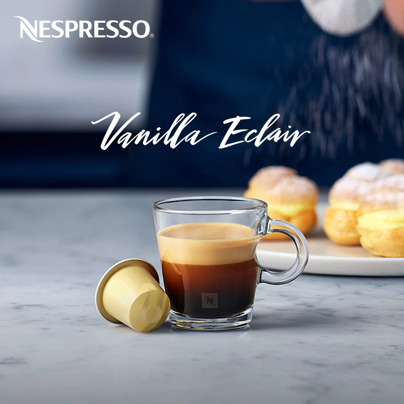 Warming vanilla on a base of malted cereal – that’s Nespresso Barista Creations Vanilla Éclair. This flavoured coffee capsule is round and smooth with a silky mouthfeel that may remind you of vanilla eclairs.