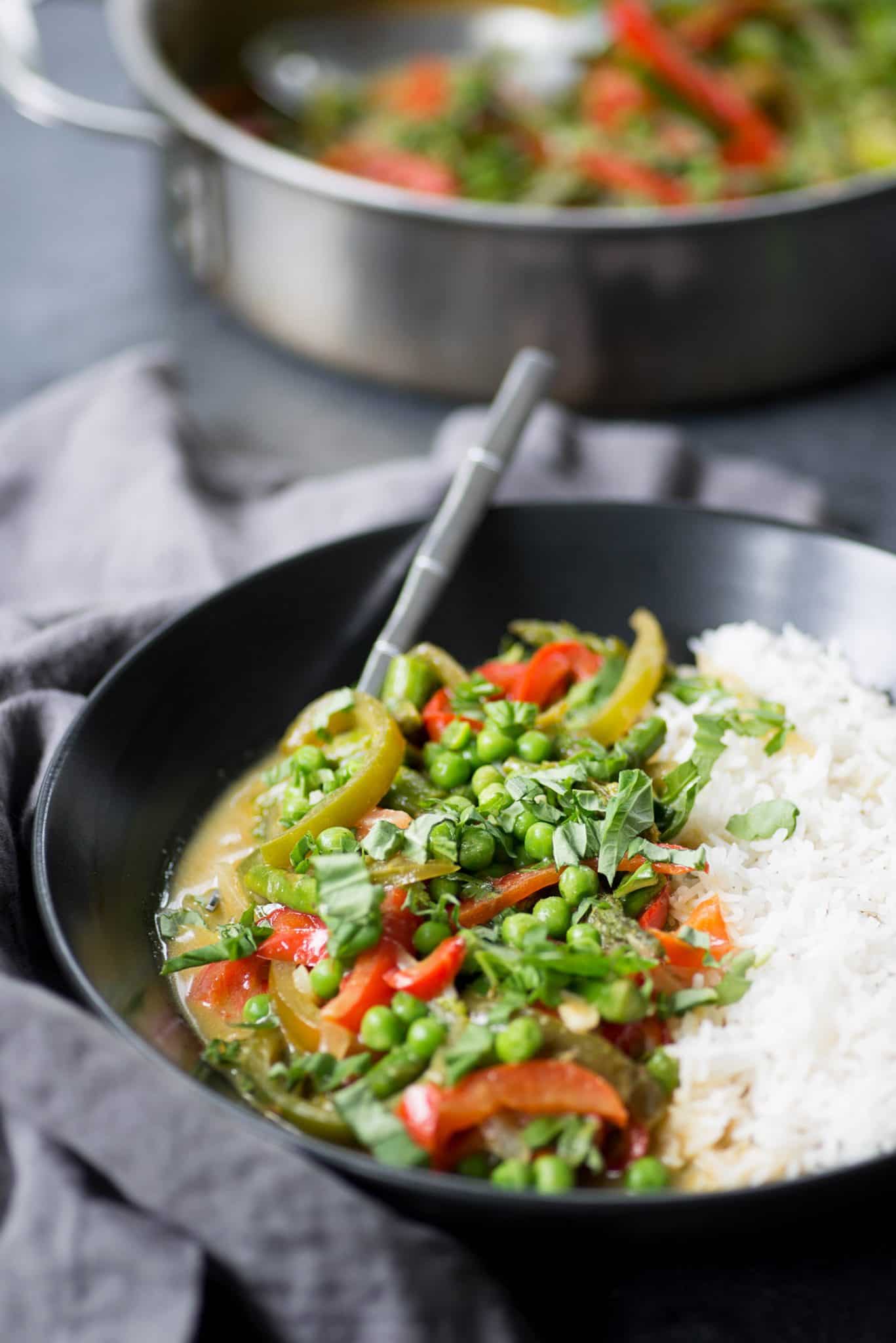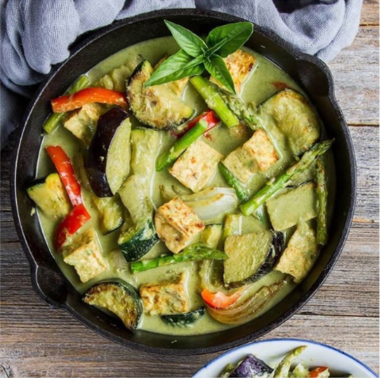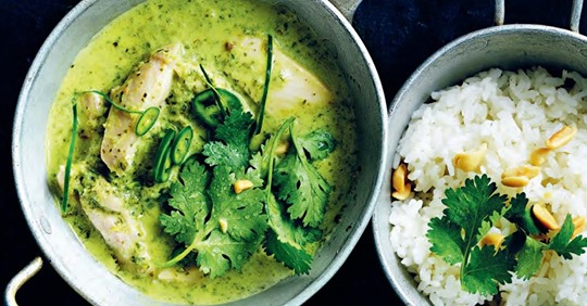 - Đun nóng 240 ml nước cốt dừa trên lửa vừa. - Cho gói gia vị cà ri xanh vào, khuấy đều tay cho đến khi có váng dầu nổi trên bề mặt.
