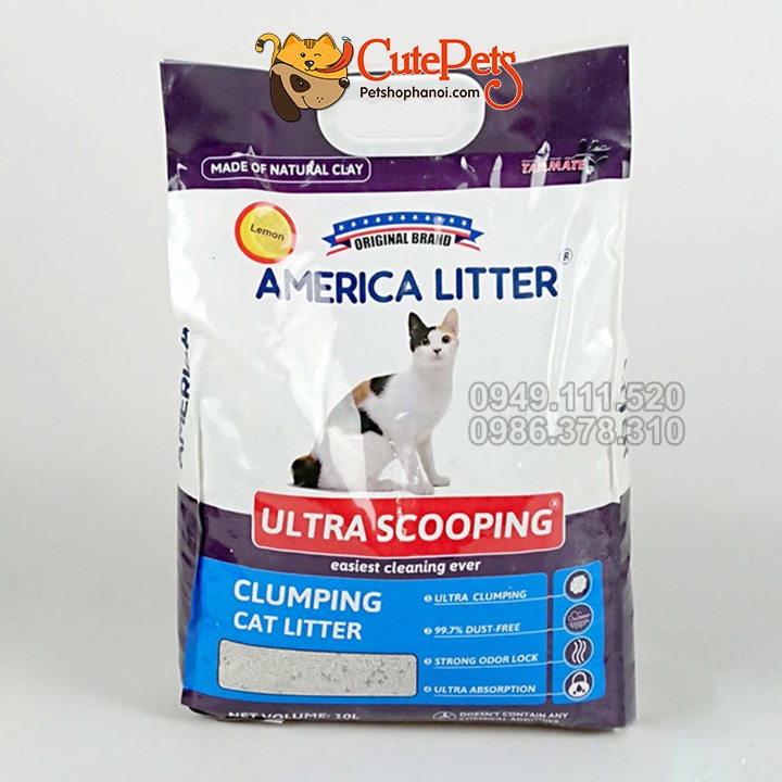 Ưu điểm cát vệ sinh cho mèo tải 2 túi, Cát mèo 10l America Litter - Không bụi, thấm hút tốt, vón cục tốt, không bị bết đáy khay vệ sinh - Khử mùi tốt - Có nhiều hương thơm: Chanh, Cafe, Oải hương (giao ngẫu nhiên)