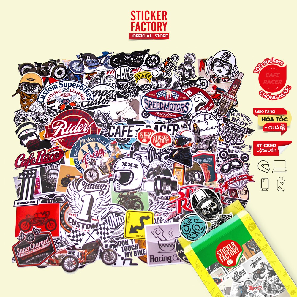 Giới thiệu Cafe Racer - hộp set 100 sticker decal hình dán nón bảo hiểm , laptop, xe máy, ô tô - STICKER FACTORY