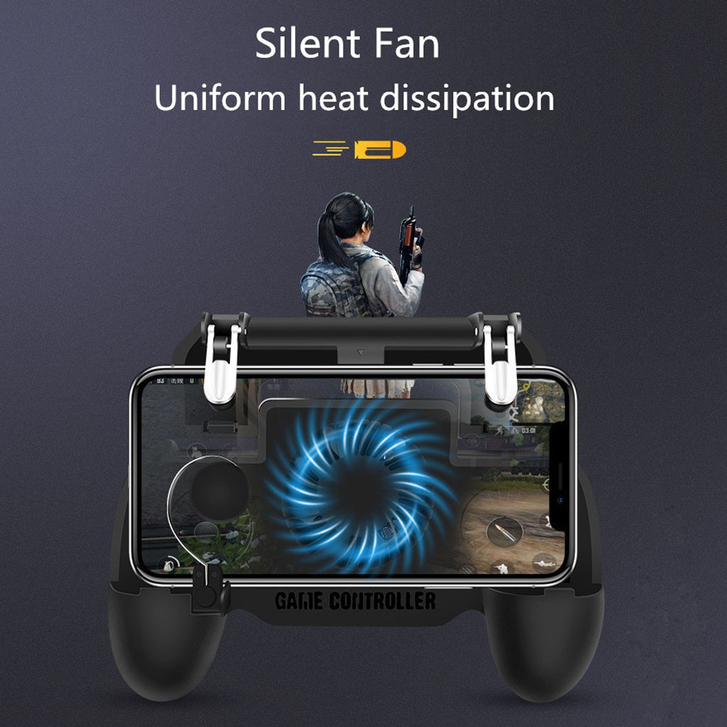 Tay Cầm Chơi Game PUBG, ROS, FF/Liên Quân Mobile/Quạt Tản Nhiệt Kiêm Sac Dự Phòng. Phụ kiện hỗ trợ chơi PUBG Mobile, RULES, Free Fire, ... Phụ kiện chơi game mobile. Bộ tay cầm tích hợp 4 trong 1: Tản nhiệt điện thoại, nút hỗ trợ chơi game, gamepad, sạc dự phòng. TÍNH NĂNG NỔI BẬT: - Nút bấm tích hợp ra mặt sau thông minh cho cảm giác như chơi tay game Play Station. - Nguyên lý cảm ứng cơ học, ổn định. Cần gạt hợp kim nhôm bền bì. - Thiết kế tối giãn, hỗ trợ mọi khe cắm sạc và tai nghe. - Lồng quạt lớn tối ưu tản nhiệt, cực kỳ êm ái, không gây tiếng ồn. - Co giãn thông minh dùng chung được cho nhiều mẫu smart phone khác nhau. - Thời lượng pin tương đối khủng: 2000 mAh so với 1 chiếc tay cầm, cho thời lượng tản nhiệt lâu mà không cần cắm sạc, đồng thời giúp "cấp cứu" cho điện thoại lúc cần thiết. - Hai cổng IN/OUT riêng biệt, hỗ trợ mọi chuẩn sạc của Android và iOS. - Thiết kế gọn, cảm giác cầm chắc chắn, tương thích với nhiều nút hỗ trợ di chuyển joystick khác - Giá đỡ điện thoại tiện ích. 【THÔNG TIN SẢN PHẨM】 Thiết bị Tương thích với các kích cỡ từ 4.7inh- 6.5 inh của điện thoại thông minh màn hình cảm ứng. Chẳng hạn như cho iOS / cho Samsung / cho Lumia / cho Huawe / cho Nokia / cho HTC, v.v ... Miễn là điện thoại có chiều dài trong vòng 6,5 inch. Các trò chơi: chẳng hạn như trò chơi di động Fortnite / cho Rules of Survival / cho Survivor Royale / cho Dao ra / cho PUBG miễn là trò chơi cho phép tùy chỉnh và kéo các phím. 【DUNG LƯỢNG PIN】 Hết pin gây ra sự bực bội và đôi khi là hoàn cảnh khó khăn trong các trò chơi. Với bộ điều khiển trò chơi này, bạn không bao giờ phải lo lắng về việc hết điện, bạn đang sạc, mọi lúc, mọi nơi. Pin lithium 2000mAh có thể sạc lại, sạc an toàn và hiệu quả, không cần lo lắng điện thoại của bạn không đủ điện trong khi chơi . Bộ sản phẩm bao gồm: 1 x Bộ tay cầm chơi game