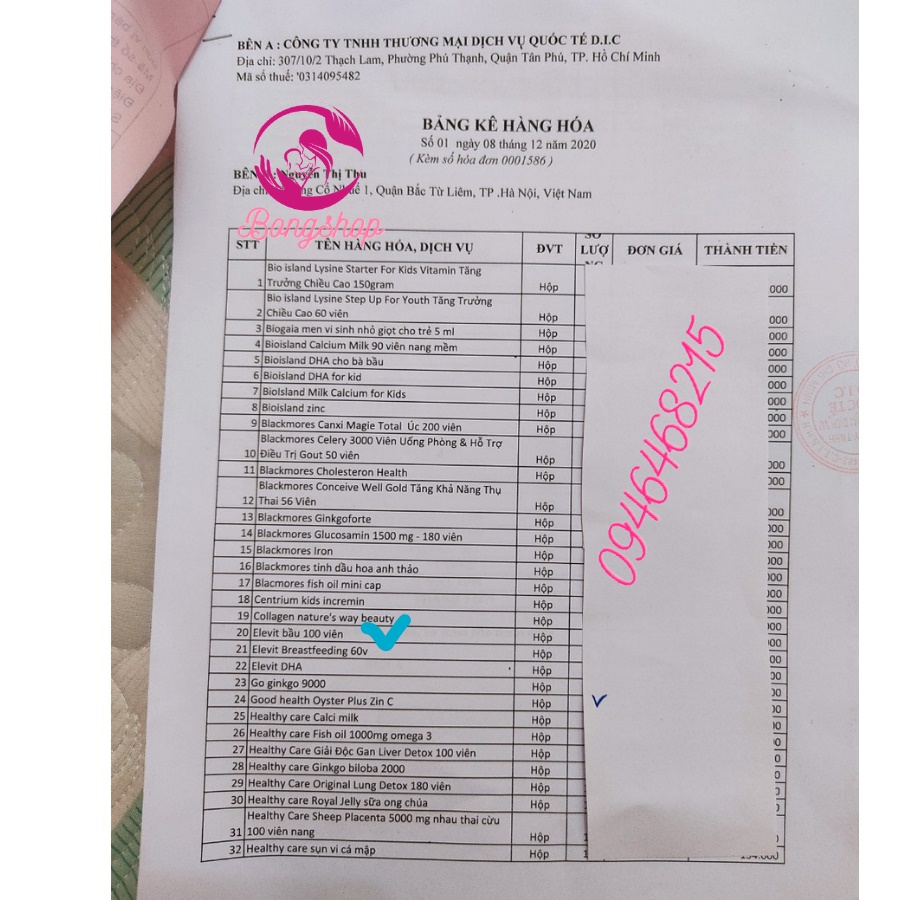 LỜI HỨA CỦA SHOP MẸ BỐNG - BÁN HÀNG VÌ CHỮ TÂM ✔ SHOP MẸ BỐNG- Chăm sóc sức khỏe Gia đình bạn ✔ Uy tín đã được đảm bảo qua hàng vạn đơn hàng trên toàn quốc ✔ Nhiều năm nay rất nhiều các cơ sở chỉ vì lợi nhuận mà sẵn sàng bán hàng giả, hàng nhái, hàng kém chất lượng tràn lan. SHOP MẸ BỐNG kinh doanh bằng cái Tâm. Vì mục tiêu đưa những sản phẩm tốt và chất lượng nhất đến cho các mẹ và bé. Rất nhiều khách hàng đã giới thiệu lại cho bạn bè, người thân mua vì SHOP MẸ BỐNG đã duy trì chữ tín này qua nhiều năm. ✔ Sản phẩm luôn có giấy tờ, nguồn gốc xuất xứ rõ ràng để đưa đến tay khách hàng. ✔ Khi mua sản phẩm của SHOP MẸ BỐNG chỉ cần các bạn không hài lòng các bạn cứ từ chối nhận hàng, SHOP MẸ BỐNG vẫn vui vẻ mang về và không thu thêm bất kỳ phí gì ạ. ✔ Tuyển sỉ và CTV toàn quốc, chiết khấu cực cao, hàng luôn có sẵn đầy kho, gọi là ship ngay ====================== 1. Thông số sản phẩm: ✔️ Tên sản Phẩm: Elevit bầu Úc ✔️ Sản xuất tại : Bayer AUSTRALIA Ltd - Địa chỉ: 875 Pacific Highway, Pymble NSW 2073 AUSTRALIA ✔️ Nhập Khẩu: Công ty TNHH Thương mại dịch vụ quốc tế D.I.C - Địa chỉ: 307/10/2 Thạch Lam, Phường Phú Thạch, Quận Tân Phú, Thành Phố Hồ Chí Minh ✔️ Xuất xứ hàng hoá: Úc ✔️ Đóng gói: 90 viên ✔️ Date: Mới nhất (Date thay đổi theo lần hàng về mới nhất