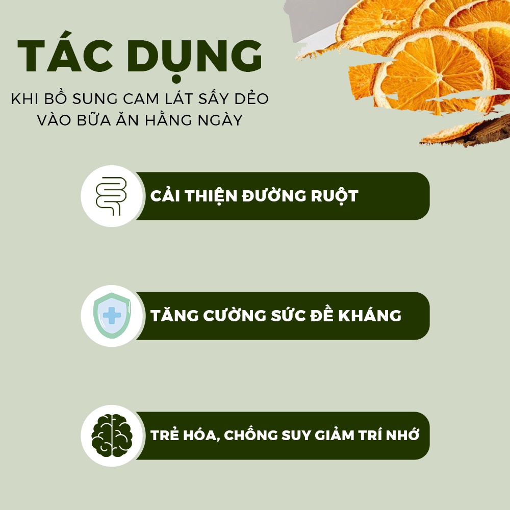 Thông tin sản phẩm Cam lát sấy dẻo 100g thơm ngon nhiều dinh dưỡng làm đẹp da hoa quả sấy đồ ăn vặt healthy Nonglamfood Tính chất có lợi của cam: Cam là loại trái cây luôn được các chuyên gia dinh dưỡng khuyên ăn thường xuyên. 1. Hợp chất naringin: Giảm mỡ máu, mỡ gan, giảm đường máu. 2. Nhiều chất xơ: Giảm hấp thu mỡ và cholesterol, bảo vệ thành ruột, nhuận trường, cải thiện sức khỏe ruột già. 3. Flavonoid, polyphenols (chất kháng oxi hóa): Giảm nguy cơ các bệnh liên quan đến ô xi hóa: ung thư, tiểu đường, giảm trí nhớ, lão hóa. 4. Tinh dầu (limonene, g-terpinene, pinene): Thông cổ, kháng vi sinh vật gây bệnh. 5. Nước cam vắt, múi cam nhiều vitamin C dồi dào, hỗ trợ đề kháng cơ thể, giải cảm.