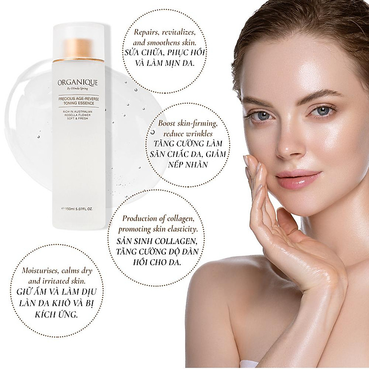 - Nước Cân Bằng Organique Chống Lão Hóa Age-Reverse Toning Essence tăng tính đàn hồi của da, làm lành da tổn thương và săn chắc da.