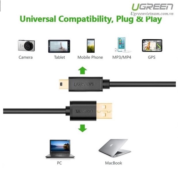 Máy tính & Laptop > Thiết Bị Lưu Trữ > USB & OTG || Cáp chuyển USB 2.0 sang Mini USB, OTG USB to mini USB 1,5m, mạ vàng, tốc 480Mbps Chính hãng Ugreen 10385