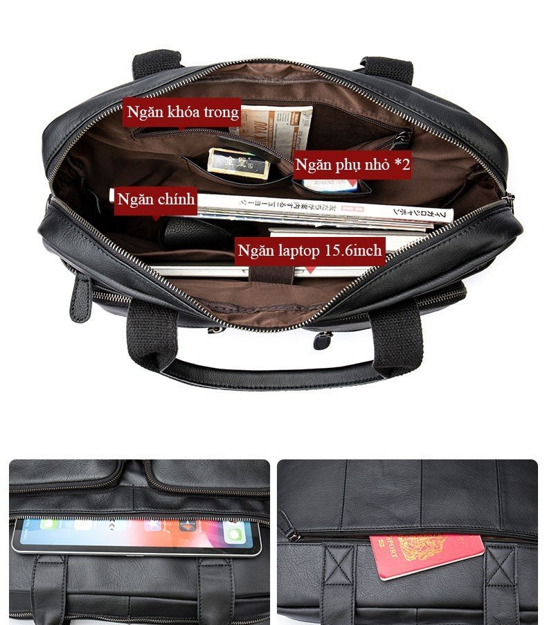Bên trong túi được chia thành nhiều ngăn nhỏ: 1 ngăn khóa kéo, 1 ngăn chống xốc dành cho laptop 15.6", 1 ngăn lớn chính giữa, 2 ngăn nhỏ để ví, điện thoại thêm 3 ngăn trước cặp và 1 ngăn khóa kéo sau cặp. Thoải mái để tài liệu quan trọng, phụ kiện cá nhâ