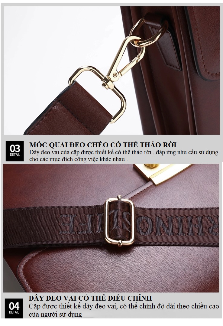 Đường chỉ may của cặp được trau chuốt và tỉ mỉ đến từng góc cạnh, từng chi tiết nhỏ đều được chăm chút để tạo ra sản phẩm hoàn hảo nhất. Không chỉ có thiết kế quai xách tay, Cặp Da Nam Công Sở RH03 còn được trang bị thêm quai đeo chéo giúp bạn linh hoạt hơn khi sử dụng. Với kiểu dáng gọn gàng nhưng đầy mạnh mẽ, cứng cáp, Cặp Da Nam Công Sở RH03 còn là phụ kiện thời trang lý tưởng cho các đấng doanh nhân khi gặp đối tác hoặc khách hàng.