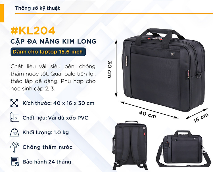 - Cặp đa năng Kim Long KL204 có ngăn chính rộng rãi giúp bạn thoải mái đựng đồ đạc, tài liệu. Ngăn đựng laptop có dây cố định giúp bảo vệ laptop khỏi va đập