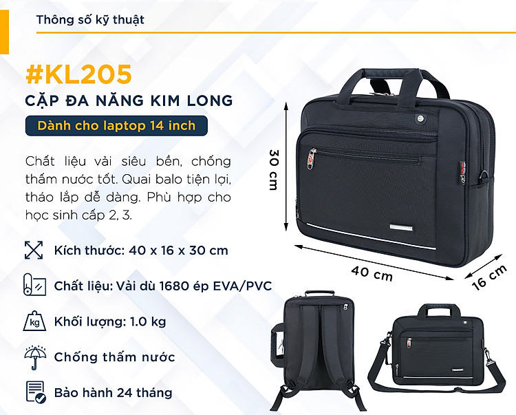 - Cặp đa năng Kim Long KL205 có ngăn chính rộng rãi giúp bạn thoải mái đựng đồ đạc, tài liệu. Ngăn đựng laptop có dây cố định giúp bảo vệ laptop khỏi va đập