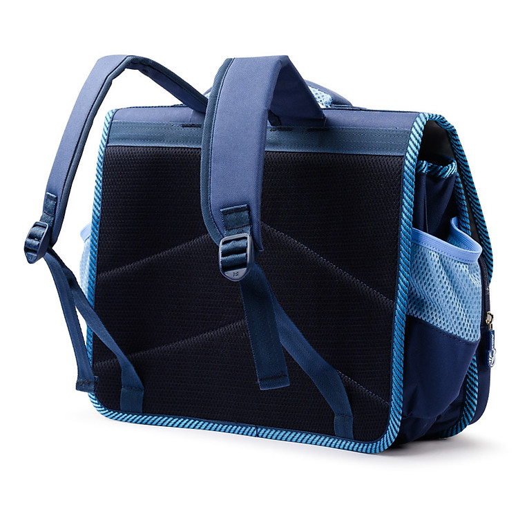 Đường may chắc chắn và quai đeo được may thêm dây trợ lực phía trên để phân tán đều lực trên vai bé và hỗ trợ quai đeo khi mang đồ nặng. Phía sau cặp được may đệm bảo vệ thắt lưng dày, có độ đàn hồi cao và chống va đập cực tốt bảo vệ lưng và cột sống bé. Bên cạnh đó, ở phần đệm lưng được bố trí thêm các rãnh thoáng khí giúp luân chuyển khí giữ lưng của bé luôn thoáng mát. Bên hông cặp có hai ngăn nhỏ đựng nước, sữa hoặc những vật dụng linh tinh khác