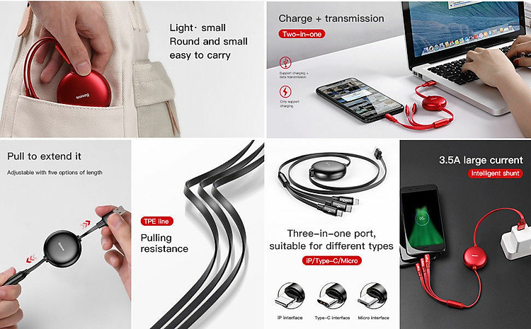 Tính năng sản phẩm Cáp sạc BASEUS CAMLT-ZY 1.2M 3 in 1 Little Octopus dây rút, Light-ning & Micro & Type-C