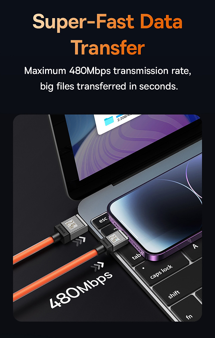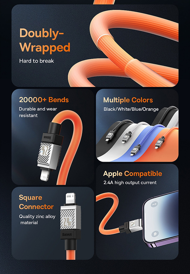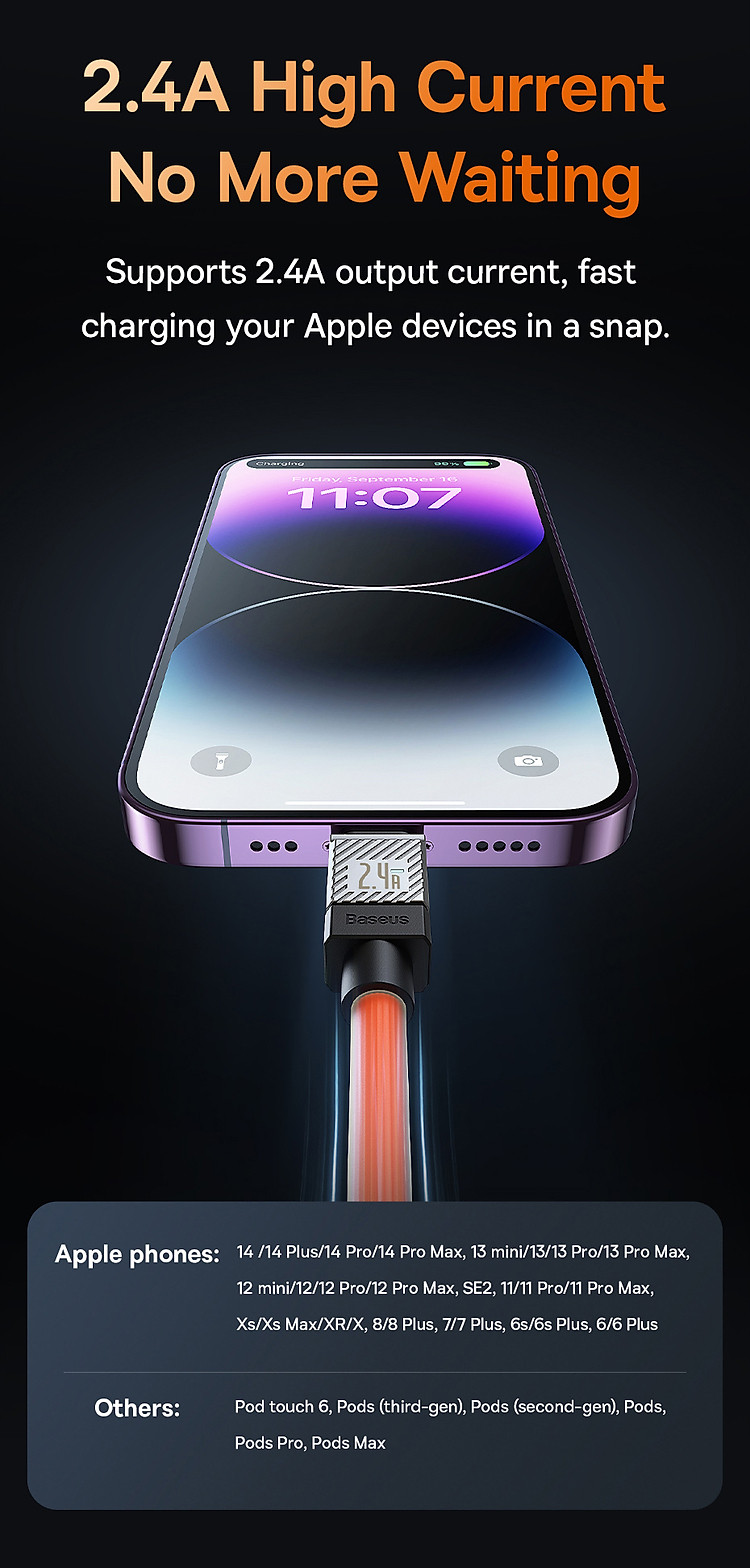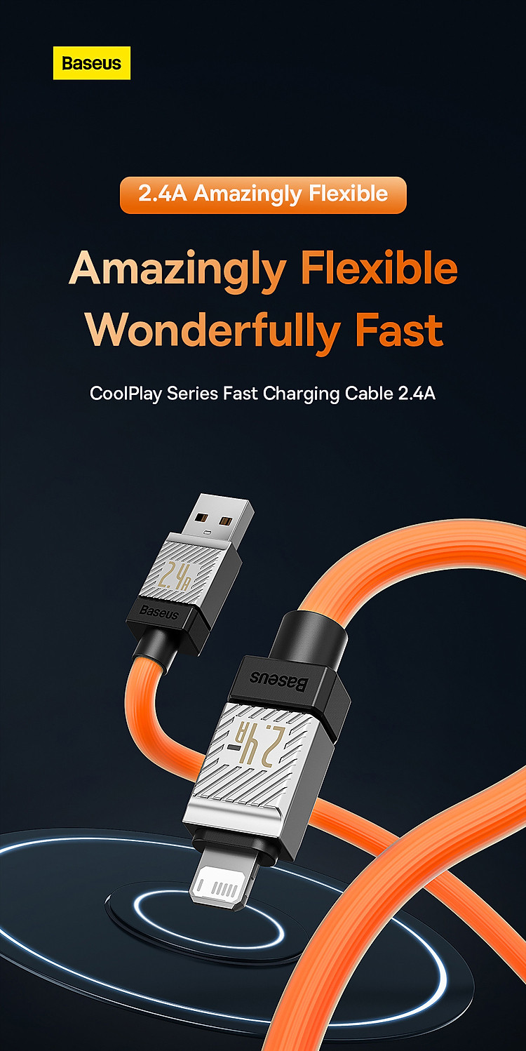 Cáp Sạc Nhanh Cho iP Baseus CoolPlay Series Fast Charging Cable USB to iP 2.4A có khả năng sạc nhanh với dòng điện đạt tới 2.4A, giúp giảm thời gian sạc và tăng hiệu suất sạc cho thiết bị của bạn.