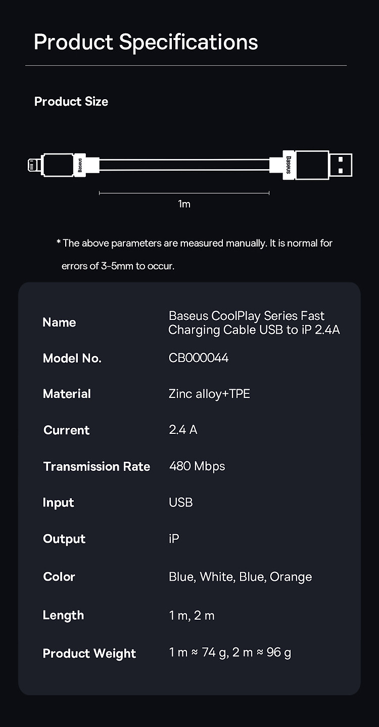 Tóm lại, Cáp Sạc Nhanh Cho iP Baseus CoolPlay Series Fast Charging Cable USB to iP 2.4A là một sản phẩm tiện ích và hiệu quả để sạc các thiết bị sử dụng cổng sạc iP của bạn.