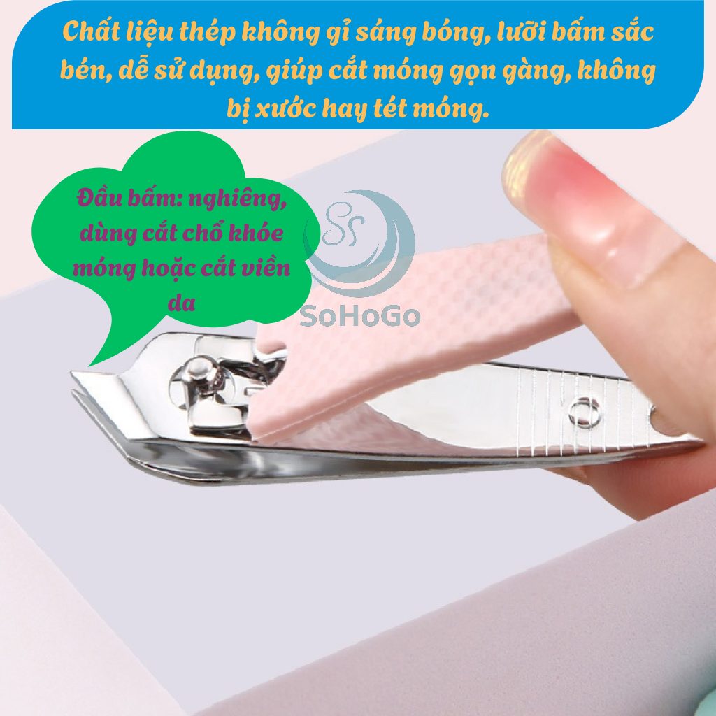 Bộ dụng cụ cắt móng tay mini gồm 2 chiếc bấm móng được đựng trong hộp nhựa xinh xắn, gọn gàng và dễ bảo quản. Thiết kế hiện đại, màu sắc tươi sáng (hồng, xanh) tạo cảm giác đáng yêu, phù hợp cho cả trẻ em và người lớn. Chất liệu thép không gỉ sáng bóng, lưỡi bấm sắc bén, dễ sử dụng, giúp cắt móng gọn gàng, không bị xước hay tét móng. Phần tay cầm có hoa văn chống trượt, cầm chắc tay, an toàn khi thao tác. Hộp nhựa trong suốt giúp bảo quản sạch sẽ, dễ mang theo khi đi du lịch, công tác hoặc để trong túi xách.