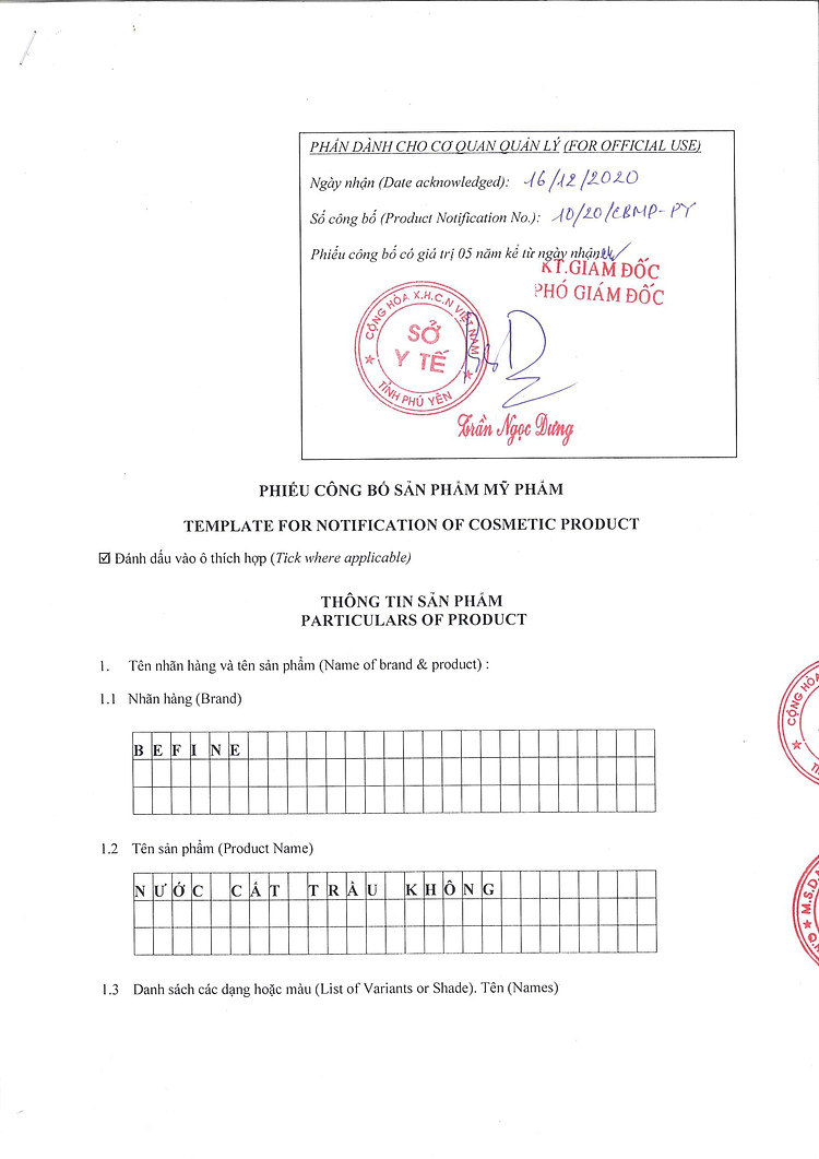 SỐ CÔNG BỐ MỸ PHẨM: 10/20CBMP-PY