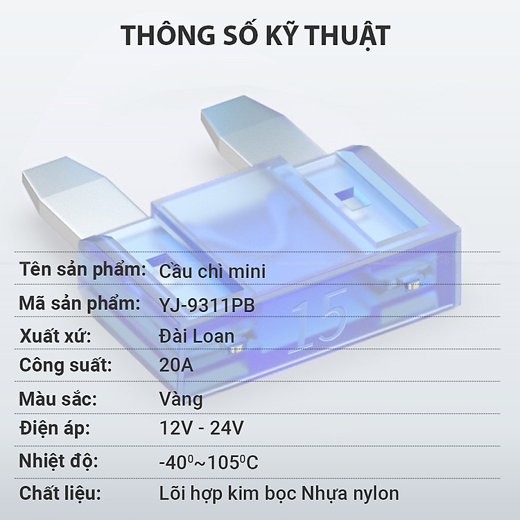 Cầu chì mini YJ-9311PB 20A được làm bằng hợp kim kẽm và nhựa theo tiêu chuẩn và điện áp định mức, sử dụng phù hợp cho nhiều vị trí như ô tô, xe máy, nhà ở, các công trình hay ứng dụng sản xuất.