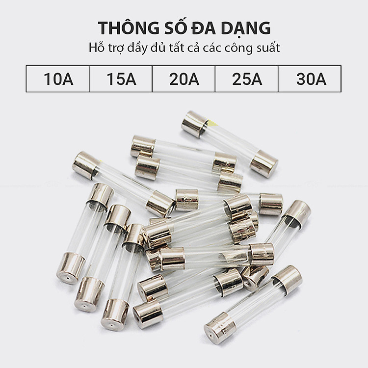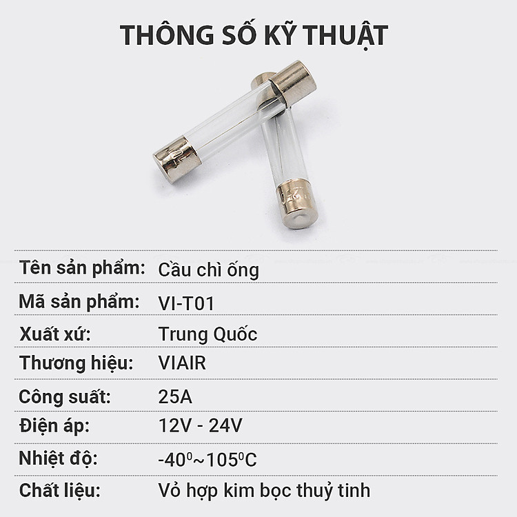 Cầu chì ống VIAIR VI-T01 25A được làm bằng dây chảy và chất liệu thuỷ tinh theo tiêu chuẩn và điện áp định mức, sử dụng phù hợp cho nhiều vị trí như ô tô, xe máy, nhà ở, các công trình hay sử dụng trong các mạch điện tử.