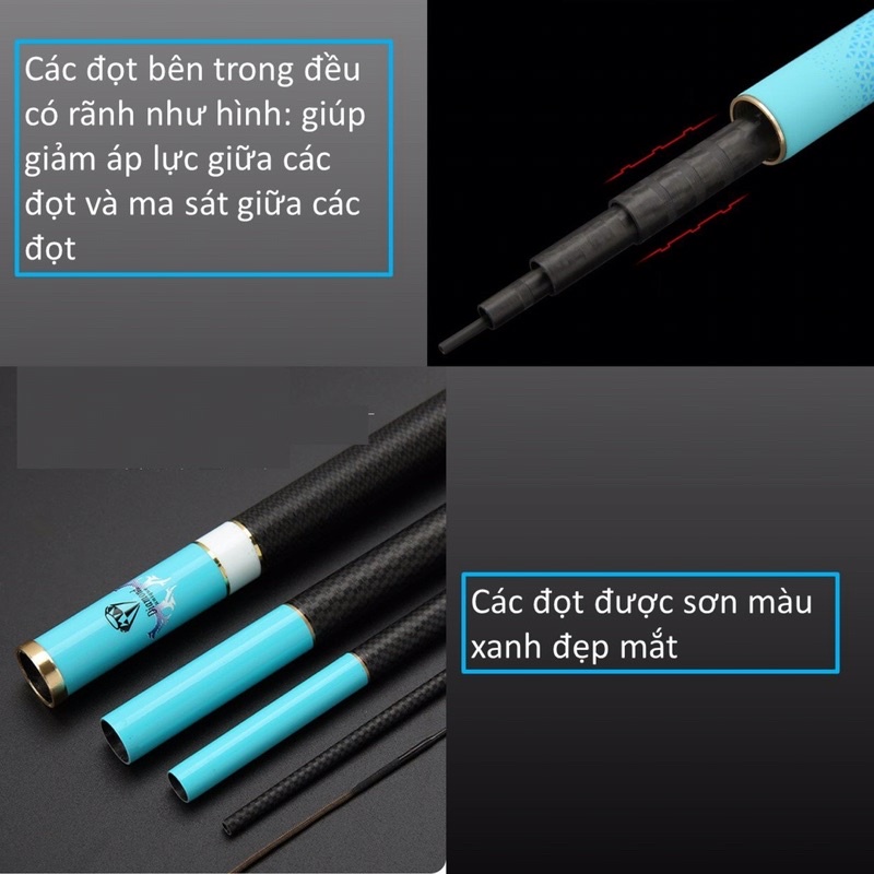 🎁Cần Tay 5H Bình Minh Xanh Giá Sốc 2022 ( Tặng kèm ngọn) 💘Cần có các size: 4m5, 5m4, 6m3 💘Cần có màu xanh kim cương, hoa văn vô cùng tinh xảo 💘Nước sơn từ thương hiệu nổi tiếng TDHS từ Trung Hoa 💘Phần thân sơn nhẵn bóng, phần tay cầm thô ráp, mềm mại 💘Các đọt trong đều được sơn màu xanh rất đẹp mắt ~~~~~~~~~~~~~~~~~~~~~~~~~~~ 🦋THÔNG SỐ KĨ THUẬT🦋 💘Chất liệu: Hàm lượng carbon đạt 90% 💘Đọt/Lóng chính: chiều dài 111cm 💘Ngọn cần: đường kính 1mm 💘Tải tĩnh: 2 kí 💘Ngọn cần có bu chống xoắn, xoay 360 độ 💘Miệng đọt chính được gia cố vòng kim loại; chống vỡ, nổ, sứt miệng đọt 💘Các lóng có các rãnh, giúp giảm ma sát, áp lực giữa các đọt 💘Nắp đầu cần, nắp đuôi cần đều bằng kim loại không rỉ, giúp bảo vệ các lóng tốt nhất 💘4m5: 122 gram (Nặng) x 5 (đọt/lóng) x 16.7mm (đường kính lóng chính) x 7kg(tải cá tối đa) 💘5m4: 165 gram (Nặng) x 6 (đọt/lóng) x 18.9mm (đường kính lóng chính) x 9kg(tải cá tối đa) 💘6m3: 230 gram (Nặng) x 7 (đọt/lóng) x 21.3mm (đường kính lóng chính) x 11kg(tải cá tối đa).