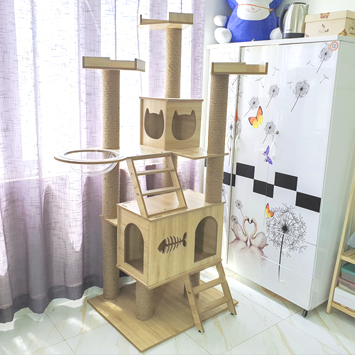 Nhà cây cho mèo tích hợp 2 trong 1, vừa có thể chơi đùa, cào lại như một căn hộ cao cấp.. Nó sẽ vừa với hai con mèo trưởng thành một cách thoải mái. Ở bên cạnh, mèo của bạn sẽ được sử dụng cầu thang đưa chúng lên ban công trên cùng của căn hộ hình hộp. Ngôi nhà trên cây cho mèo có thể chứa đến 2 bé mất an toàn, vui nhộn và bền.