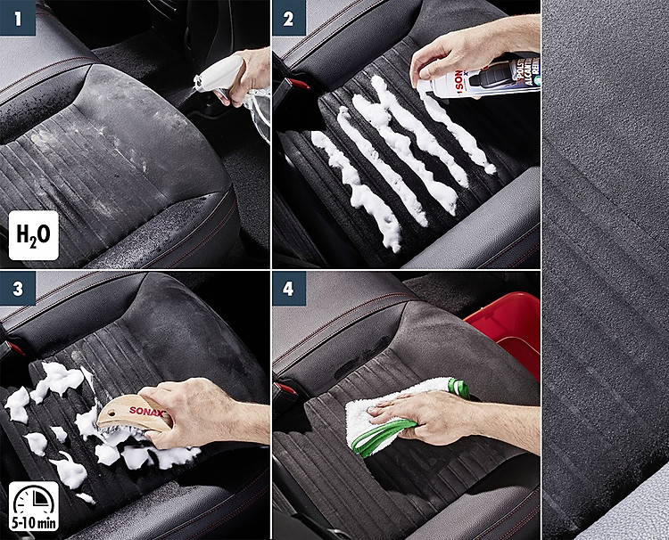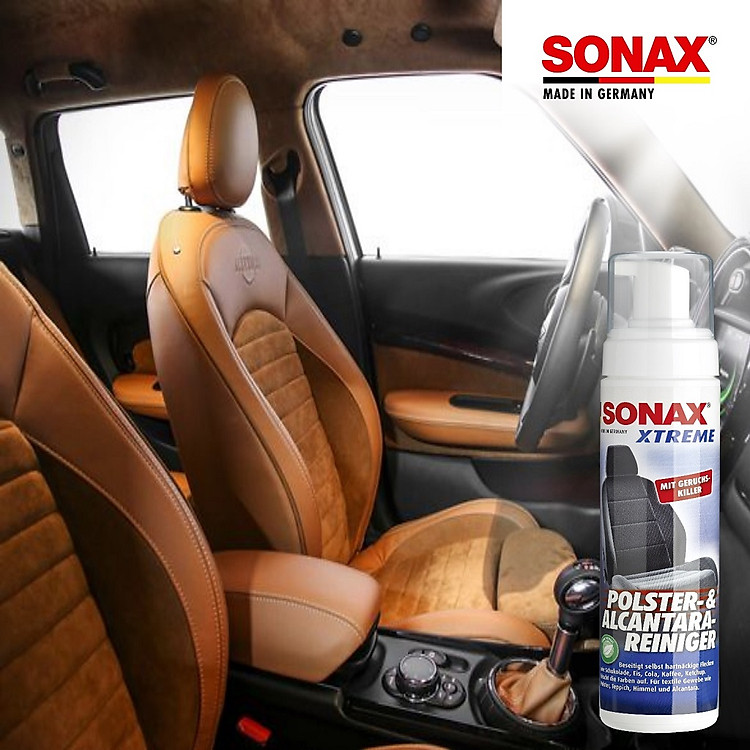 Chai xịt bọt làm sạch nhanh và khử mùi hôi trên vải, thảm, nỉ Sonax 206141 250ml Là loại hợp chất chuyên dụng để làm sạch nhanh và khử mùi hôi trên vải, thảm, nỉ, pa-nen, trần nóc xe, nệm, alcantara và nội thất gia đình hổ trợ phục hồi vải như mới, loại bỏ các vết bẩn cứng đầu như Socola, kem, coca, cafe, dầu mỡ, nước cà chua,