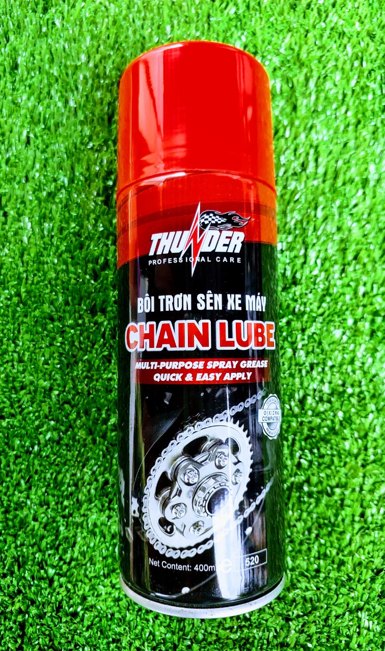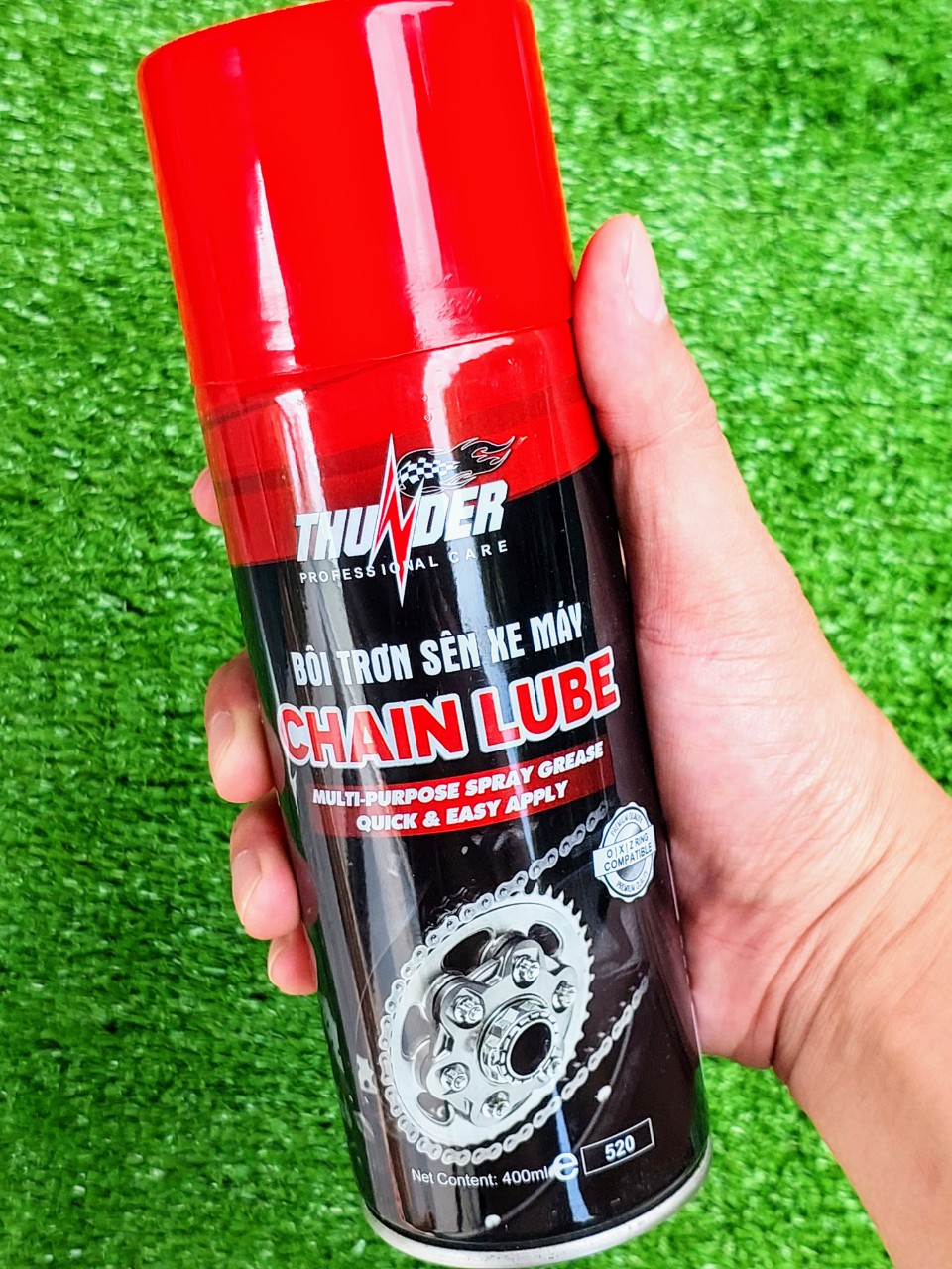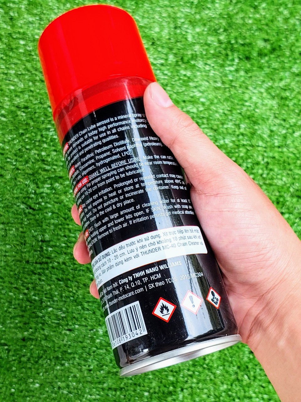 Hướng dẫn sử dụng | B1: Dùng chai MC-40 400ml xịt ướt đều sên, sau đó dùng bàn chải chà đều và kỹ để loại bỏ mảng bám và cát bụi bám vào sên. sau đó dùng Chai MC-40 xịt lại 1 lần nữa cho sạch sên, rửa sạch cát bẩn trên sên.B2: Đợi sên khô, sau đó dùng chai Thunder Chain Lube 400ml xịt ướt đều sên với lượng vừa đủ, Đợi khoản 10 đến 20p để dung dịch thấm đều sên sau đó tiếp tục vận hành. |