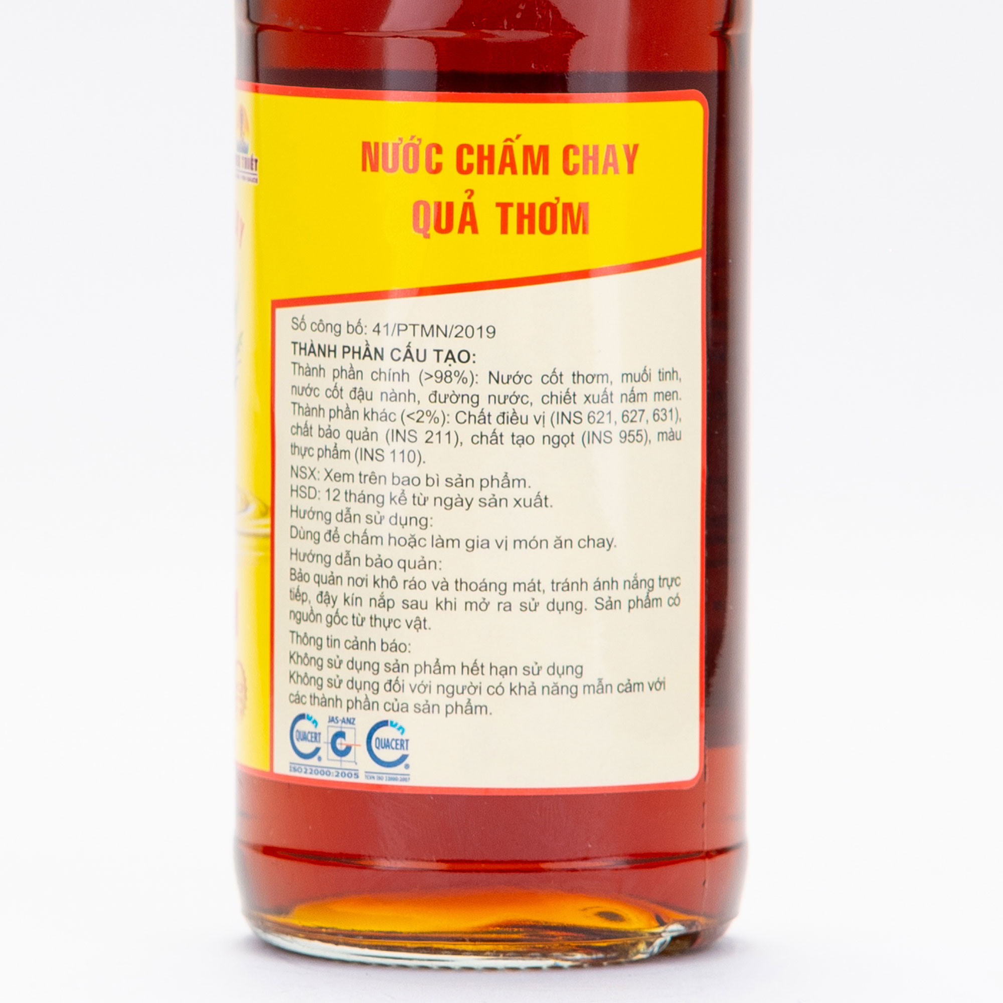 NƯỚC CHẤM CHAY QUẢ THƠM được chắt lọc từ những quả thơm tươi mát, hạt muối mặn của vùng biển Phan Thiết Mũi Né kết hợp với phương pháp lên men cổ truyền và quy trình sản xuất khép kín trên dây chuyền công nghệ tiên tiến, tạo ra dòng nước chấm chay có nguồn gốc từ thiên nhiên mang hương vị ĐẬM ĐÀ, THƠM NGON ĐẾN TỪNG GIỌT. Ngoài ra, nước chấm chay Quả Thơm – Phan Thiết Mũi Né được Bộ Y Tế công nhận đạt chuẩn quốc tế HACCP, đảm bảo sức khỏe cho người tiêu dùng.