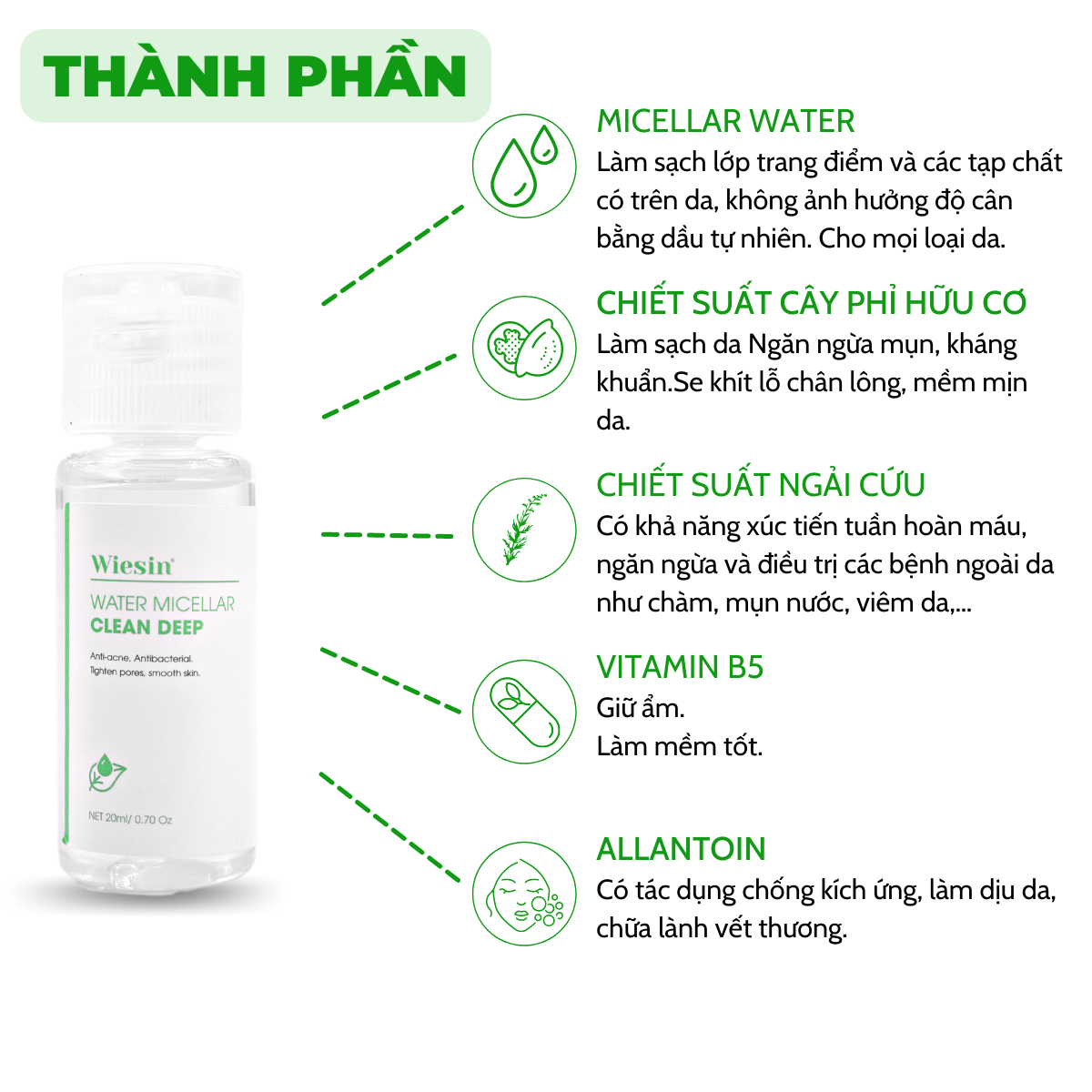 Sản phẩm của thương hiệu WIESIN được nghiên cứu bởi các chuyên gia, sản xuất từ các thành phần thảo dược thiên nhiên cao cấp đạt chuẩn CGMP, ISO nguyên liệu nhập khẩu từ Đức, Nhật : chiết xuất từ Cocoamido Propyl Betaine từ dầu dừa tự nhiên, Camellia Sinensis (Green tea) chiết xuất trà xanh, chiết xuất từ rau má, Artemisia Vulgaris extract chiết xuất ngải cứu, Dry coffee seeds chiết xuất từ hạt cafe, (Allantoin ) một hợp chất tự nhiên được tìm thấy trong các loài thực vật khác nhau như cây liên mộc, cây sẹ, cây phong, cây hoa chuông comfrey, mầm lúa mì, “Collagen Thủy Phân” dễ dàng hấp thụ vào trong và các vitamin B3, B5,…giúp bảo vệ và cấp ẩm chuyên sâu phục hồi làn da toàn diện.