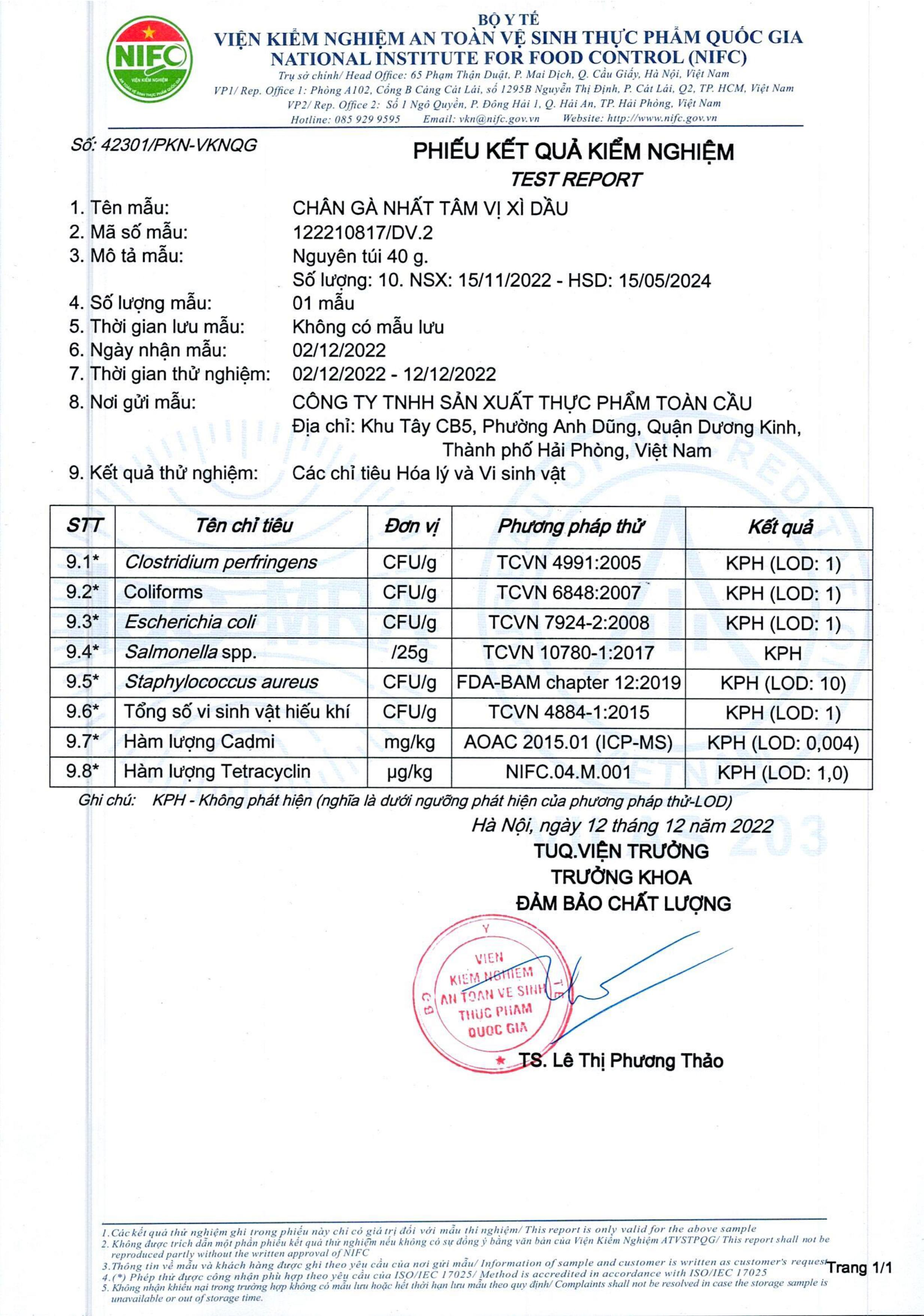 Sản phẩm đã được kiểm nghiệm phù hợp tiêu chuẩn an toàn vệ sinh thực phẩm