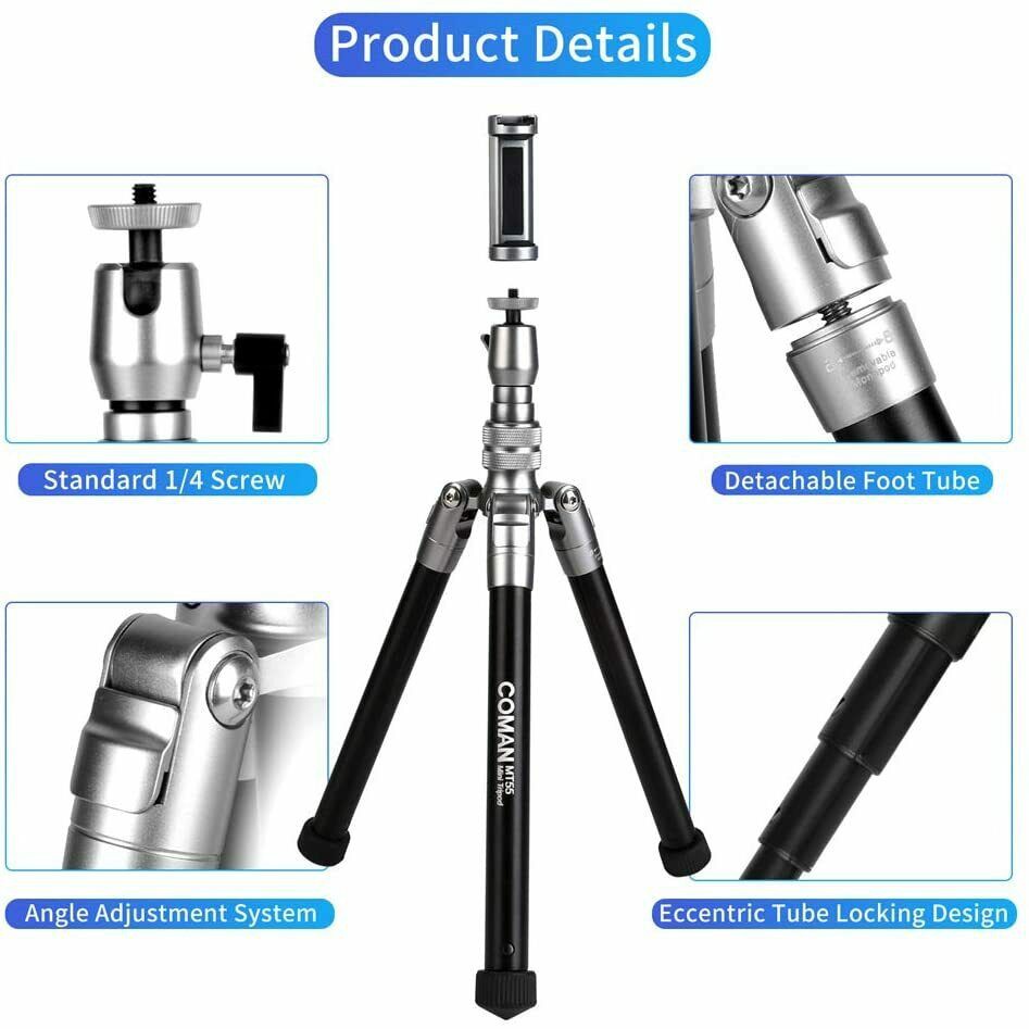 Tóm tắt sản phẩm: Thương hiệu nổi tiếng bán rất tốt trên Amazone - Chân máy du lịch Coman MT-55 - Lý tưởng để chụp ảnh tự sướng, chụp góc thấp, chụp macro, chụp toàn cảnh 360 °. - Kích thước nhỏ gọn dễ dàng mang theo và bỏ vào ba lô. - Điều khiển từ xa răng xanh không dây hỗ trợ yêu cầu chụp ảnh khoảng cách xa. - Lỗ vít 1/4 ”phụ ở mặt trên của một trong các chân cho phép lắp đặt cánh tay đòn. Giới thiệu sản phẩm: - 【Chân Máy Đa Năng】 thiết kế 3 trong 1, có thể là gậy tự sướng, chân máy ảnh và chân máy đơn.Loại bỏ cột ở giữa để trở thành gậy tự sướng với kẹp điện thoại, kết hợp gậy tự sướng và ống chân có thể tách rời để đạt được chức năng chân máy đơn. Chân máy lý tưởng cho chụp ảnh tự sướng, quay video, chụp ảnh, phát sóng trực tiếp. - 【Đầu Bóng 360 Độ Có Kẹp Điện Thoại】 Đầu bóng có thể xoay 360 ° và nghiêng 90 °.Trên đầu có vít 1/4 ”tiêu chuẩn tương thích với máy ảnh dslr và kẹp điện thoại.Thiết kế tay cầm điện thoại phù hợp với điện thoại thông minh có chiều rộng 5,5-8,5CM và thiết kế "giày lạnh" có thể gắn micrô hoặc lấp đầy ánh sáng. Nó phù hợp với máy ảnh / điện thoại thông minh - 【Nhẹ và Di động】 Giá ba chân du lịch có thể gập ngược 180 ° để tiết kiệm không gian hơn, và toàn bộ chân máy chỉ có trọng lượng 1,54lbs (0,7kg) và chiều cao khi gấp lại 9 inch (230mm), thuận tiện cho việc di chuyển và hoạt động ngoài trời với một túi xách nhỏ gọn . - 【Điều chỉnh 3 góc & mở rộng 8 phần】 Hệ thống điều chỉnh chân kiểu đẩy giúp điều chỉnh góc nhanh chóng và dễ dàng hơn. Có 3 vị trí điều chỉnh góc để chân.Chân máy có thể được mở rộng 8 phần, chiều cao có thể từ 10,23 inch (260m) đến 57 inch (1450mm), cấu trúc khóa ống lệch tâm giúp việc tháo và khóa trở nên thuận tiện và nhanh chóng hơn. - 【Đầu nối Magic Arm mở rộng】 Có thêm một lỗ vít 1/4 ”ở phía trên cùng của một trong các chân cho phép lắp đặt Magic Arm. Thử thách để phát sóng trực tiếp với nhiều thiết bị điện thoại hoặc lấp đầy ánh sáng.