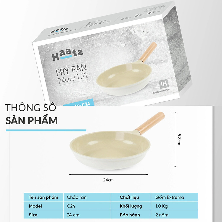 Kích thước: Ø24 x cao 5.3 cm (cán dài 20cm, đường kính đáy ~20cm)