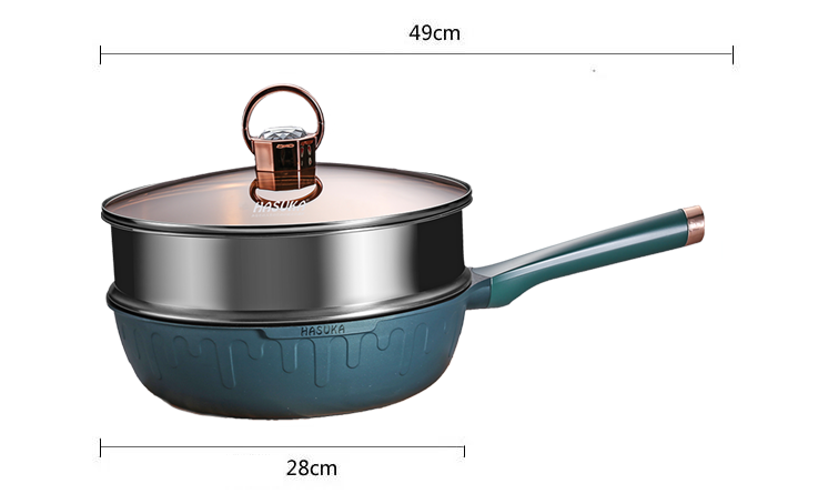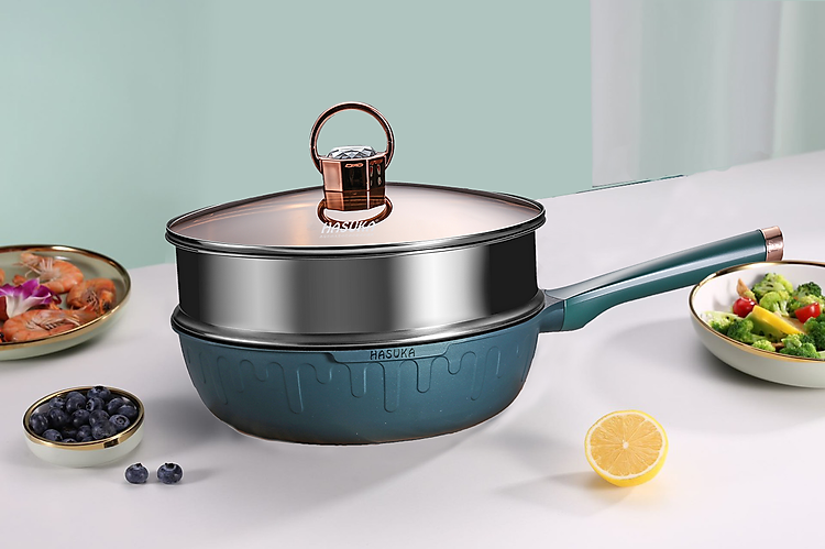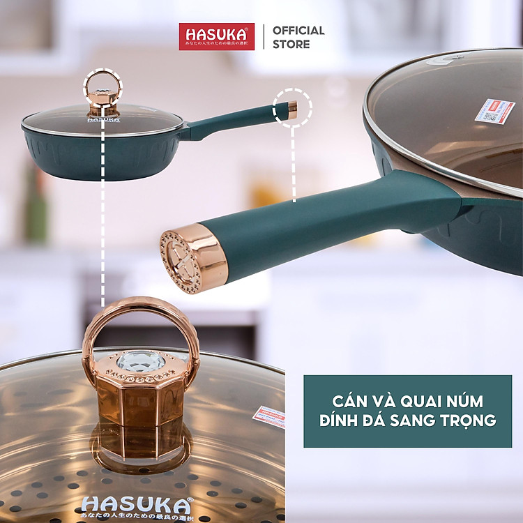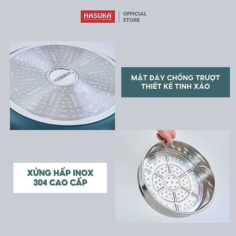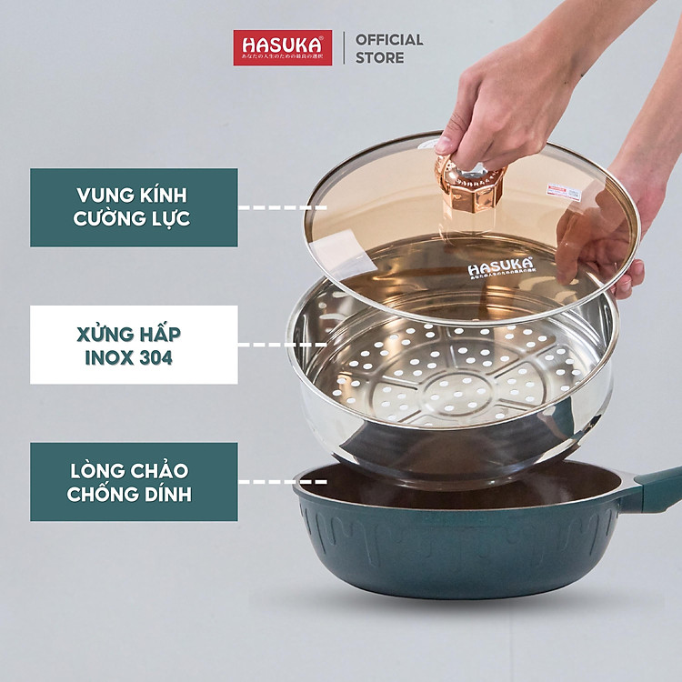 Chảo chống dính cao cấp HASUKA HSK-368CR - kèm xửng hấp inox, thiết kế cách điệu sang trọng, dùng được trên mọi loại bếp