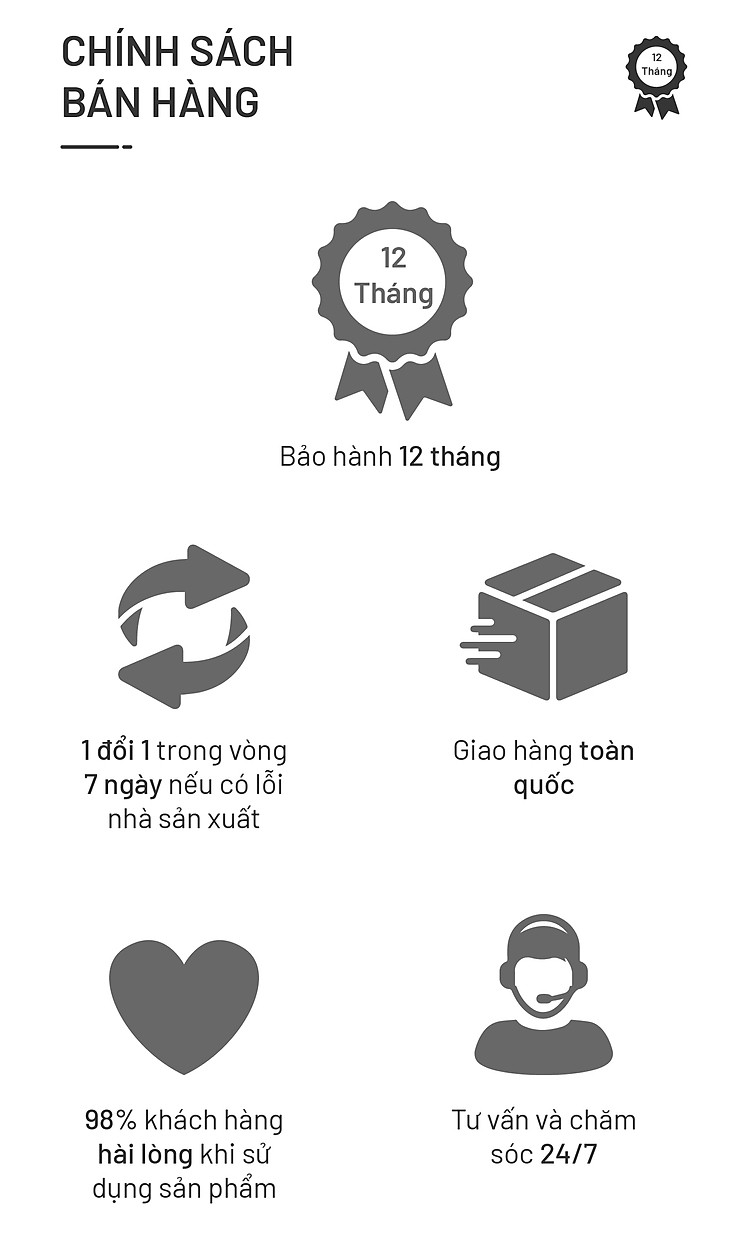 Thời hạn bảo hành sản phẩm là 12 tháng được tính kể từ ngày mua được ghi căn cứ trên phiếu bảo hành và/ hoặc tem bảo hành