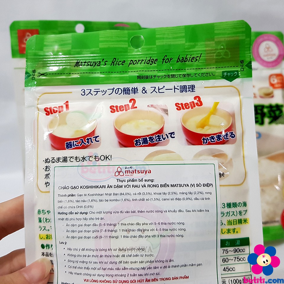 Cháo Matsuya cung cấp đầy đủ những dưỡng chất cần thiết như chất tinh bột, chất xơ, chất đạm, vitamin và khoáng chất, đảm bảo cho sự phát triển đầy đủ, hoàn thiện của bé sau này. HƯỚNG DẪN SỬ DỤNG Cách pha cháo: Cho một lượng vừa đủ vào bát, thêm nước nóng và khuấy đều. Sau khi kiểm tra nhiệt độ phù hợp hãy cho trẻ ăn. - Ăn dặm giai đoạn đầu (6 tháng): 1 thìa cháo đầy pha với 5 - 6 thìa nước nóng - Ăn dặm giai đoạn giữa (7 - 8 tháng): 1 thìa cháo đầy pha với 4 - 5 thìa nước nóng. - Ăn dặm giai đoạn cuối (9 - 11 tháng): 1 thìa cháo đầy pha với 3 thìa nước nóng.