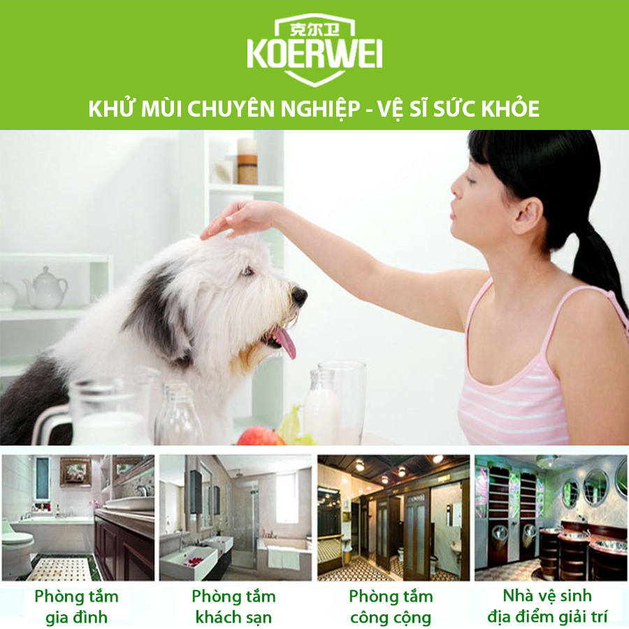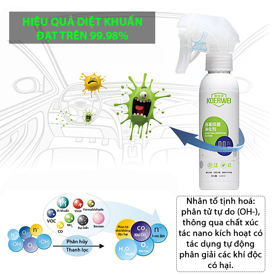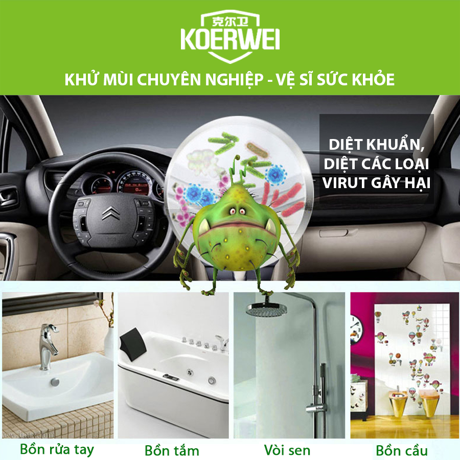 - Chất khử mùi diệt khuẩn KOERWEI 120ml đến từ thương hiệu uy tín hàng đầu sở hữu thiết kế nhỏ gọn, tinh tế, có khả năng khử mùi không khí đáng kinh ngạc. Thành phần phân tử tự do (OH-), thông qua kích hoạt chất xúc tác nano sẽ có tác dụng tự động phân giải các khí có hại. Sản phẩm được chiếc xuất từ thực vật thiên nhiên có khả năng khử khuẩn Staphylococcus aureus đạt tới 99.9%.