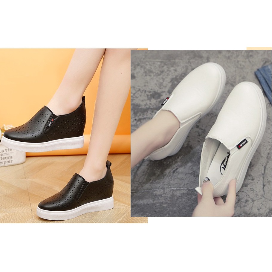 [CHẤT LƯỢNG_CÓ TRỢ SHIP] Giày độn đế nữ, giày slip on nữ độn đế da trơn cao 6cm, êm chân, Hàng Quảng Châu S065 - Chất liệu: da PU cao cấp - Có 2 mẫu mã: da trơn và lazer lổ thoáng khí để khách chọn ạ. Cả 2 loại chất lượng và đẹp, mang êm - Lazer lổ thoáng khí giúp chân không bị hầm bí khi mang lâu - DA trơn tạo nét thanh lịch, nhẹ nhàng, sang trọng - Đế độn có thể tháo ra để thay thế bằng lót độn thấp/cao hơn - Đế cao khoảng 6cm-7cm (tính luôn cả phần đế độn bên trong giày) giúp tôn thêm chiều cao cho các nàng - Giày slip on nữ độn đế Phom ôm chân, tôn dáng, thoải mái khi di chuyển - Da PU trơn dễ phối trang phục, phù hợp nhiều độ tuổi - Giày slip on nữ độn đế Là mẫu giày được nữ giới mọi lứa tuổi ưa chuộng vì tính tiện lợi, đơn giản, thời trang, cá tính - Dễ dàng phối với nhiều loại trang phục đầm, váy, short, maxi... - Mẫu giày slip on độn đơn giản không bao giờ lỗi mốt - Hàng Quảng Châu chất lượng, không giống hàng vietnam lên mẫu đâu ạ.