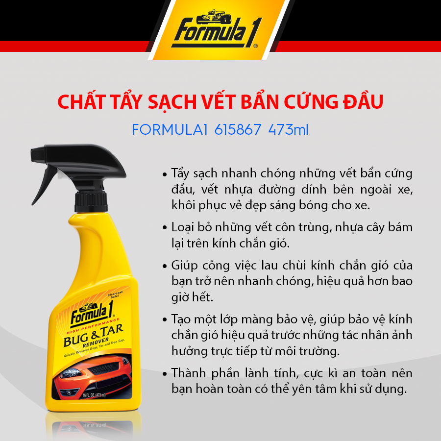 Chất tẩy sạch vết bẩn cứng đầu FORMULA1 615867 473ml không những giúp làm sạch mà còn có tác dụng bảo vệ kính chắn gió của bạn