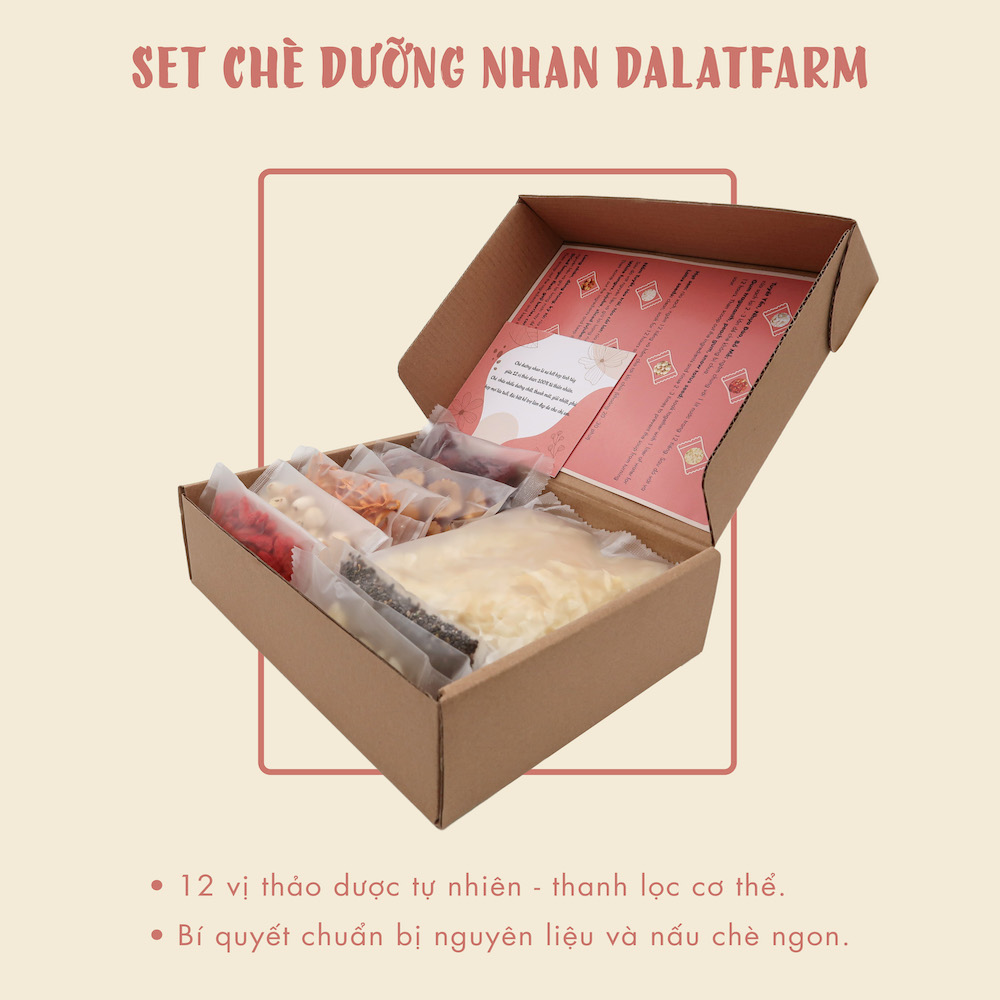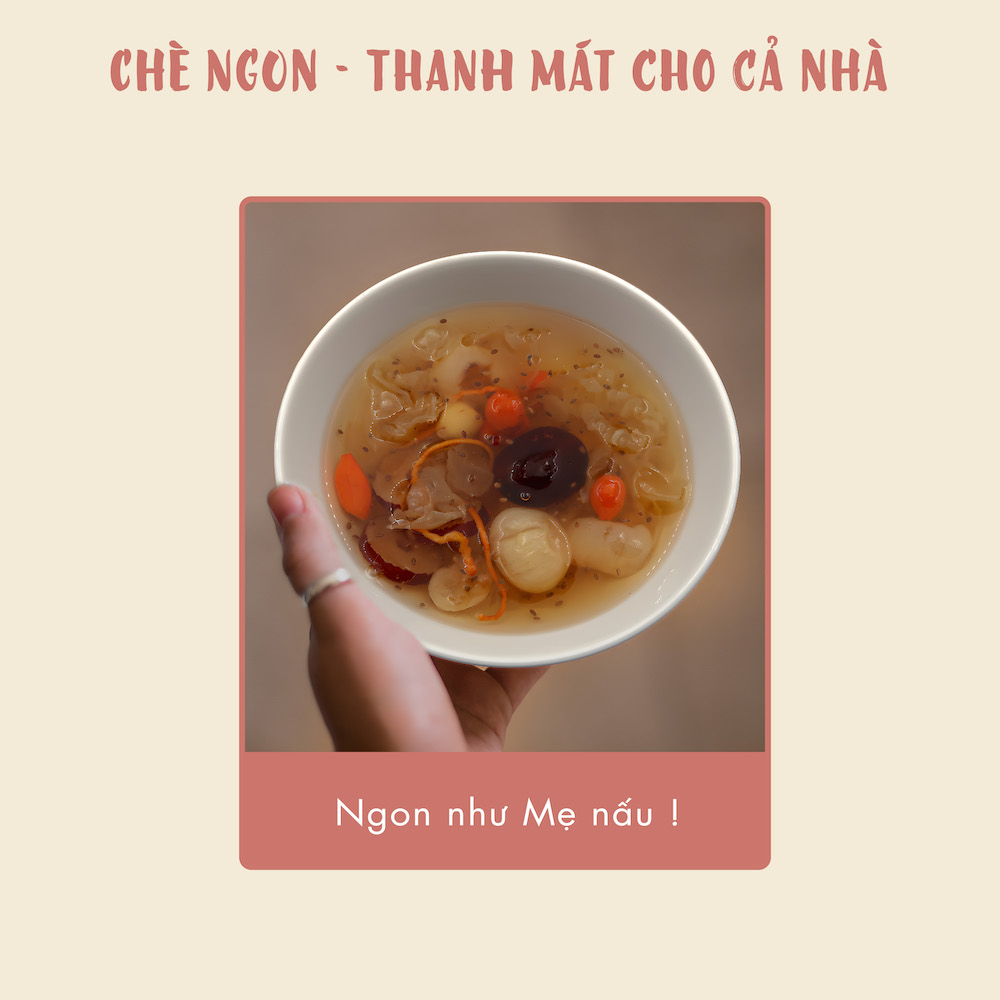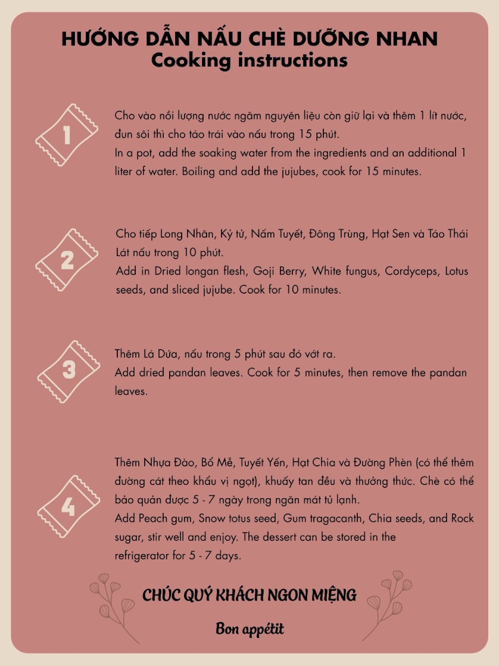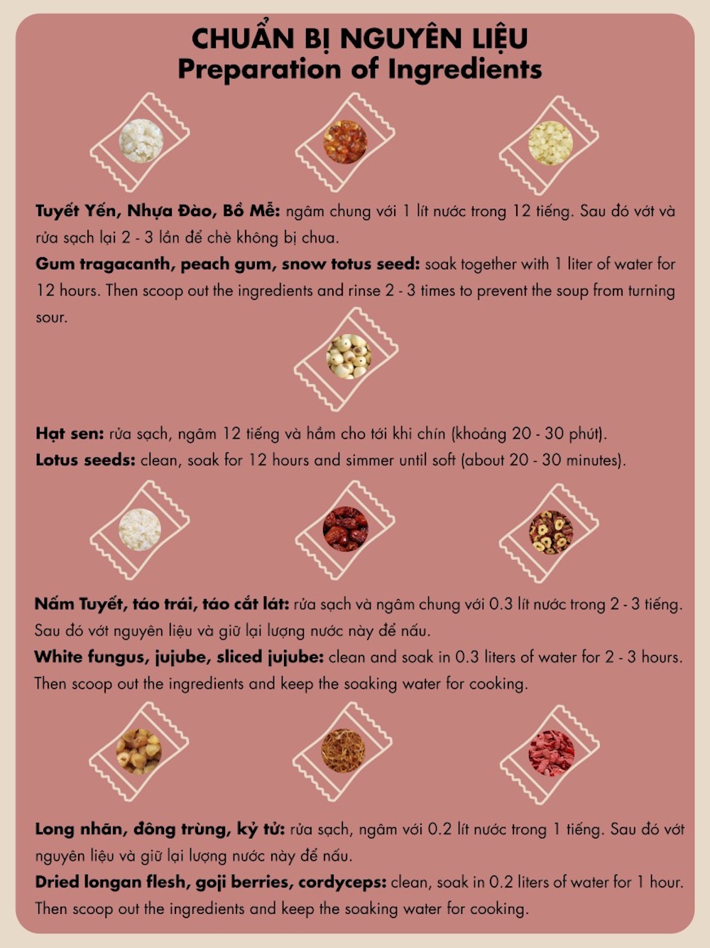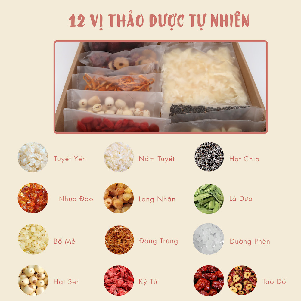 • Thành phần: 12 vị thảo dược tự nhiên: nhựa đào, bồ mễ, hạt chia, nấm tuyết, đông trùng hạ thảo, long nhãn, kỷ tử, hạt sen, táo đỏ lát, táo đỏ quả, tuyết yến, đường phèn, lá dứa.