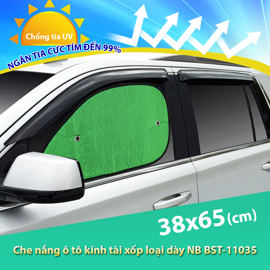 - Che nắng ô tô kính hông xốp loại dày NB BST-11035 màu lá (38x65 cm) là sản phẩm có chất lượng hàng đầu, được chế tạo từ nguyên liệu xốp và được phủ thêm lớp bạc bên ngoài có tác dụng phản quang, từ đó giúp chống lại những tác hại của tia nắng mặt trời, bảo vệ cho chiếc xe của bạn một cách hiệu quả. Sản phẩm đã nhận được đánh giá đạt chuẩn từ các chuyên gia hàng đầu, cực kì an toàn và có lợi cho xe nên bạn hoàn toàn có thể yên tâm khi sử dụng.