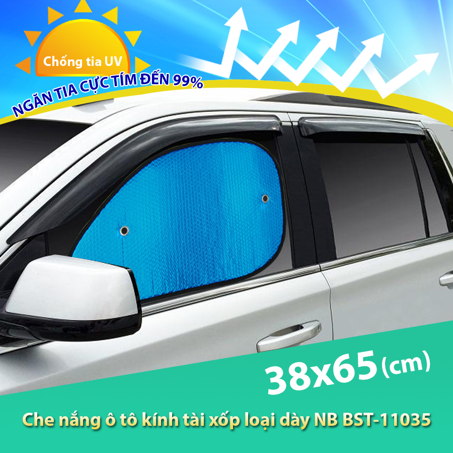 - Che nắng ô tô kính hông xốp loại dày NB BST-11035 màu lam (38*65 cm) là sản phẩm có chất lượng hàng đầu, được chế tạo từ nguyên liệu xốp và được phủ thêm lớp bạc bên ngoài có tác dụng phản quang, từ đó giúp chống lại những tác hại của tia nắng mặt trời, bảo vệ cho chiếc xe của bạn một cách hiệu quả. Sản phẩm đã nhận được đánh giá đạt chuẩn từ các chuyên gia hàng đầu, cực kì an toàn và có lợi cho xe nên bạn hoàn toàn có thể yên tâm khi sử dụng.