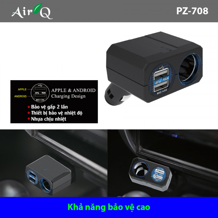 - Bộ chia tẩu ô tô 1 ổ và 2 cổng USB không dây AIR-Q PZ-708 với thiết kế sang trọng cứng cáp và tiện ích giúp chia tẩu ô tô trong xe thành hai ổ. Sản phẩm với lớp nhựa chịu nhiệt ABS và PCB ổn định giúp bạn an tâm trong quá trình sử dụng và truyền điện sang những thiết bị điển tử khác. Hệ thống đèn led và khả năng điều chỉnh góc lên đến 90 độ giúp sản phẩm phát huy tối ưu công dụng của mình trên những chặng đường dài.