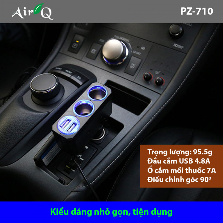 - Bộ chia tẩu ô tô 2 ổ và 2 cổng USB không dây AIR-Q PZ-710 với thiết kế sang trọng cứng cáp và tiện ích giúp chia tẩu ô tô trong xe thành nhiều ổ. Sản phẩm với lớp nhựa chịu nhiệt ABS và PCB ổn định giúp bạn an tâm trong quá trình sử dụng và truyền điện sang những thiết bị điển tử khác. Hệ thống đèn led và khả năng điều chỉnh góc lên đến 90 độ giúp sản phẩm phát huy tối ưu công dụng của mình trên những chặng đường dài.
