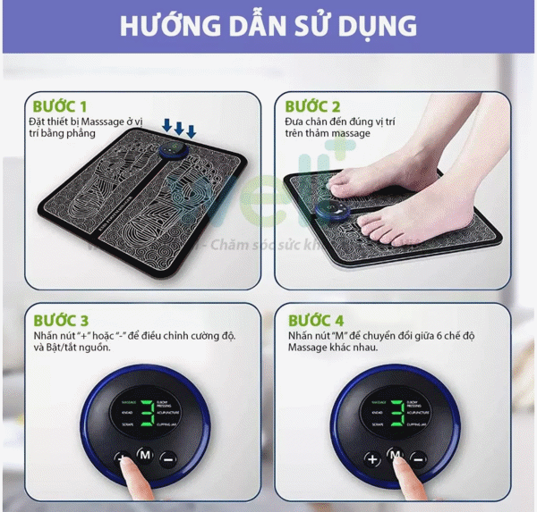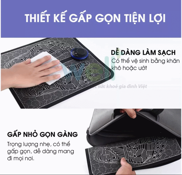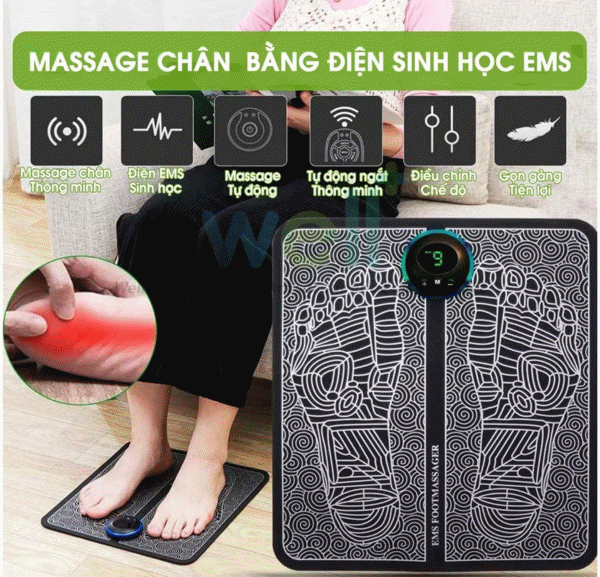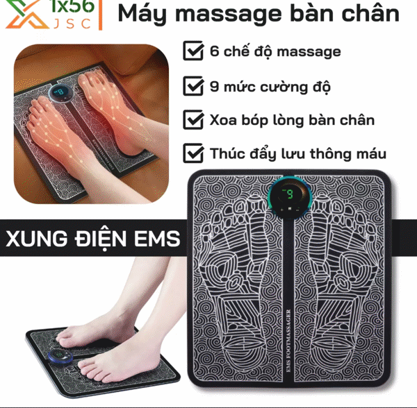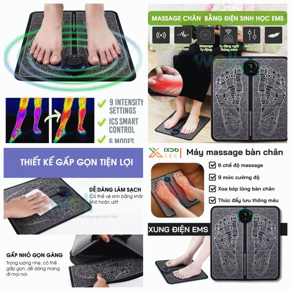 Đặc điểm của Thảm Massage Chân Xung Điện EMS Mát Xa Bàn Chân, Giúp Lưu Thông Khí Huyết, Giảm Đau Mỏi - Máy mát xa chân EMS: Miếng đệm chân mềm mại và thoải mái, trọng lượng nhẹ, có thể gấp lại, dễ dàng mang đi mọi nơi, có thể lau khô bằng khăn ướt sau khi sử dụng. Sử dụng công nghệ EMS để Massage chân, mắt cá chân, gân achilles và cơ bắp chân, để cải thiện lưu thông máu và giảm cứng cơ . (LƯU Ý: không sử dụng nếu bạn có máy tạo nhịp hoặc huyết áp cao; Vui lòng cởi tất trước khi sử dụng và đặt 2 chân của bạn lên miếng đệm chân.) - 6 chế độ Massage: chế độ M1-mát-xa, chế độ M2- nhào trộn, chế độ M3-cạo, chế độ M4 - áp lực khuỷu tay, chế độ châm cứu M5, chế độ giác hơi M6, nhiều chế độ để mô phỏng tác dụng của mát-xa thực sự để kích thích các huyệt đạo bàn chân và tác động lên các bộ phận trên cơ thể. - 9 cường độ điều chỉnh: Có 9 mức cường độ điều chỉnh trực tiếp kích thích các huyệt đạo, làm chậm sự mệt mỏi về thể chất và tinh thần, cải thiện giấc ngủ. 15 phút là một quá trình điề tr.ị, khi đến hạn, nó sẽ tự động tắt. (Khuyến nghị: Chọn mức 1 cho lần sử dụng đầu tiên) - Pin sạc với cáp USB - Áp dụng rộng rãi: Thảm Massage chân EMS được thiết kế tỉ mỉ dành cho những người yêu thích thể thao, người lớn tuổi, người lao động ngồi / đứng (đặc biệt là đi giày cao gót) trong thời gian dài, mang lại cảm giác thư giãn tuyệt vời và giảm đau nhức cho bàn chân và chân.
